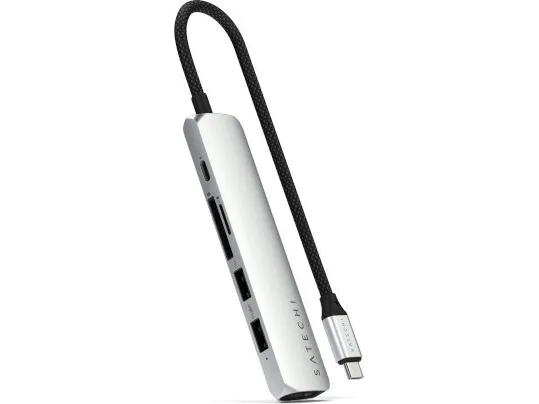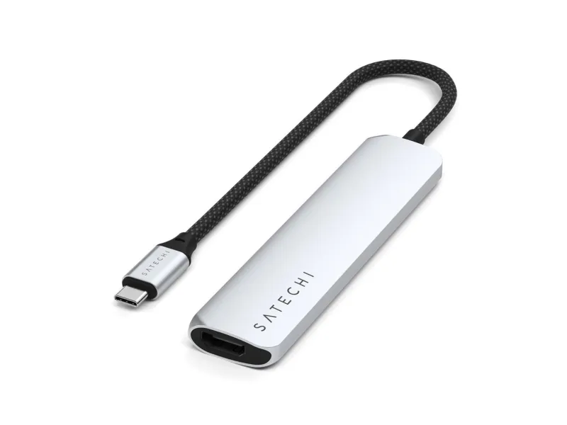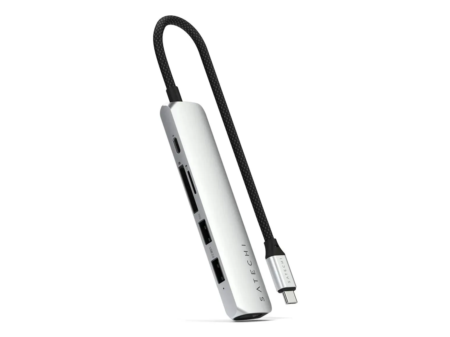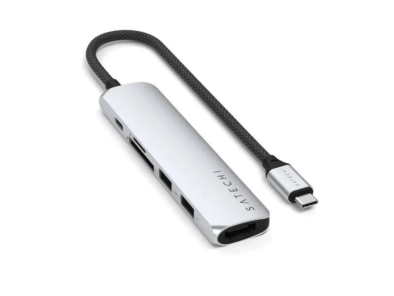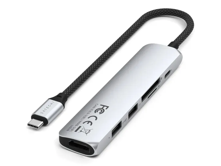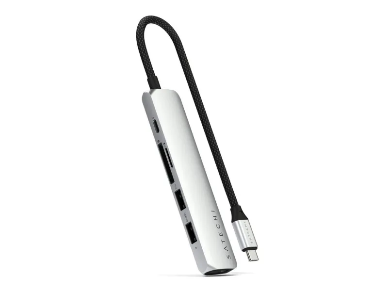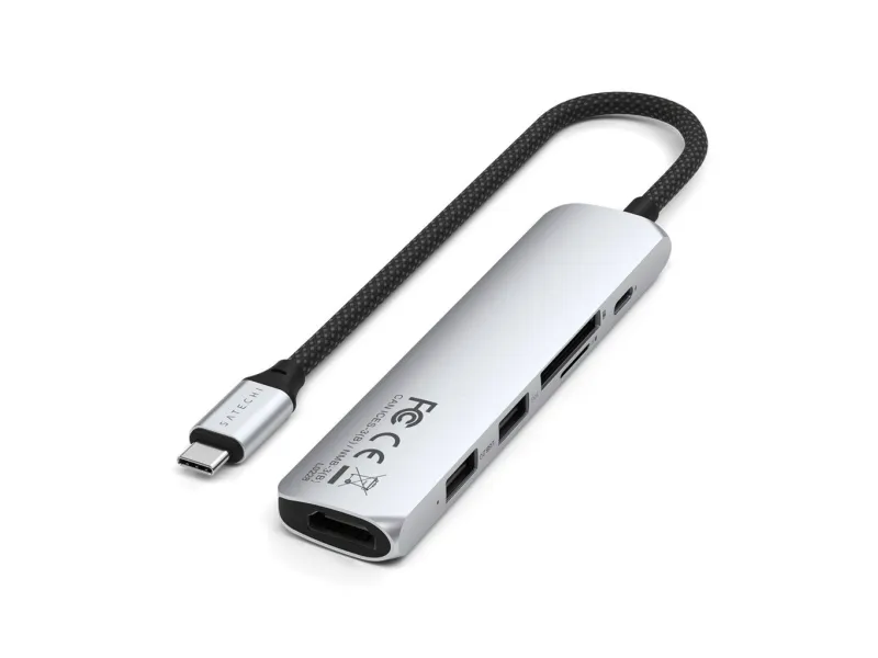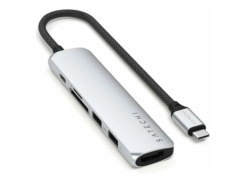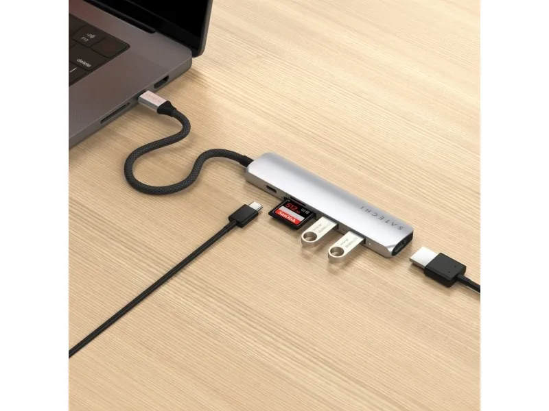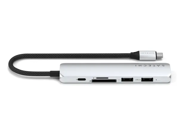 The Satechi 6-in-1 docking station is designed to enhance connectivity with its versatile ports and efficient power delivery capabilities. Featuring multiple interfaces, including USB-C with Power Delivery up to 100 W, USB-A, and HDMI, this device allows for seamless integration with various devices while providing fast data transfer speeds of up to 10 Gbps. Its aluminum enclosure adds durability while maintaining a sleek look, perfect for any workspace. Experience high-quality video output with support for 4K resolution at a refresh rate of 60 Hz, making it ideal for presentations or media streaming.