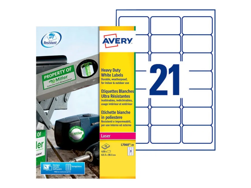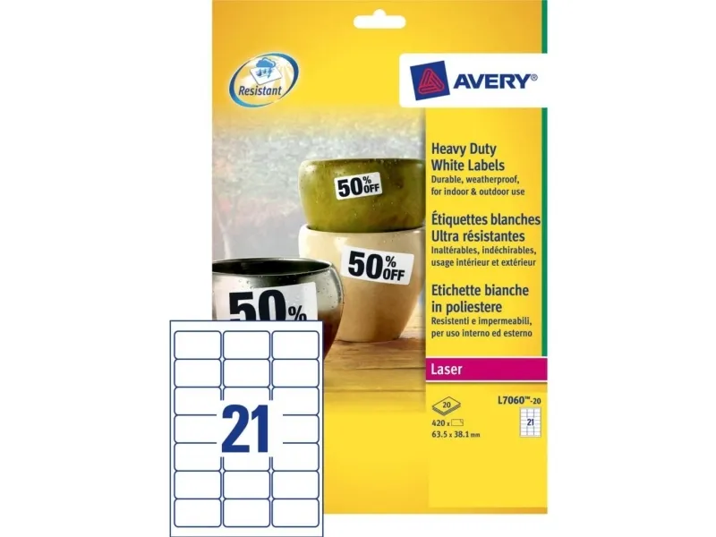 - Extra strong labels that are so durable they are even suitable for outdoor use - Ideal for labelling products and as price labels. - For whenever you need more durability than an ordinary paper label - Oil and dirt resistant, water and weather proof, tear proof and unaffected by temperature changes between -20°C to + 80°C. UV-resistant. - Save time with FREE Avery templates and software for Microsoft® Office. Easy to download and easy to use