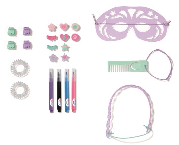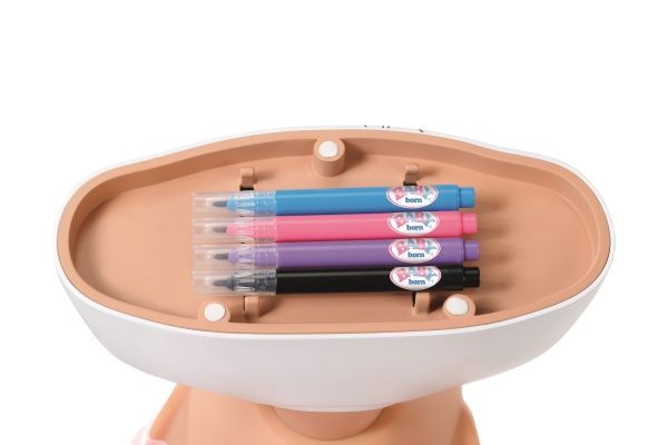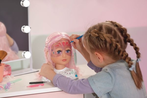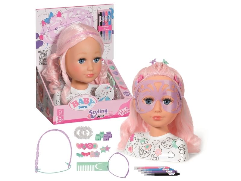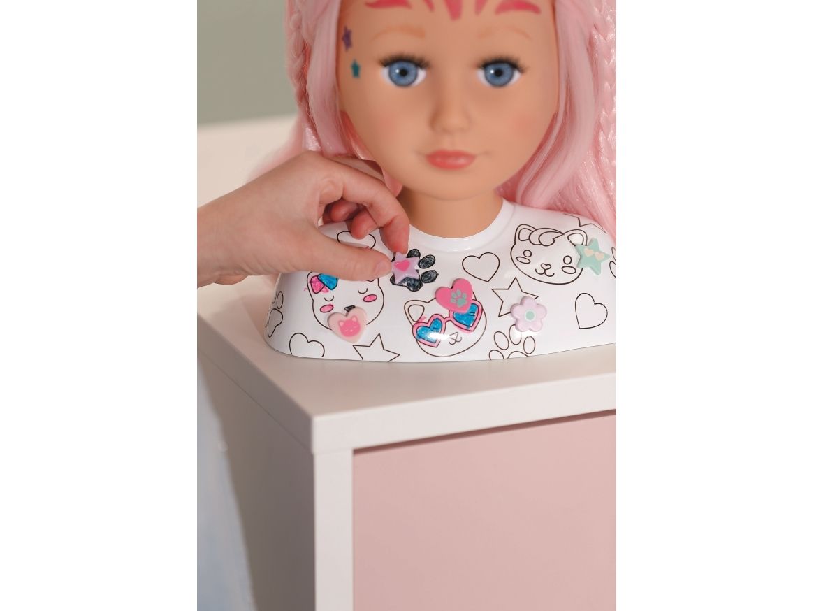 Mit dem BABY born Styling Kopf Kreativ sind der Fantasie und Kreativität keine Grenzen gesetzt. Der 22cm große Styling Kopf kann mit den beiliegenden Markern und der zugehörigen Schablone geschminkt und bemalt werden. Doch damit nicht genug: auch die Büste kann mit den bunten Markern ausgemalt und mit 10 pastellfarbenen Pins individuell gestaltet werden. Wird mal nicht mit den Markern gemalt, so können sie unter der Büste verstaut werden.Das Highlight ist natürlich das lange rosa Haar aus hochwertigem Nylon. Mit dem passenden Zubehör können die coolsten Frisuren gezaubert werden. Die Pins können dabei auch auf dem Haarband zum Einsatz kommen. • Mit hochwertigem rosa Haar aus Nylon und tollen Accessoires zum Frisieren • Mit Markern und Schablone zum Bemalen • Mit Pins zum Dekorieren der Büste und des Haarbands
