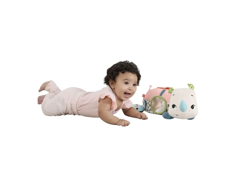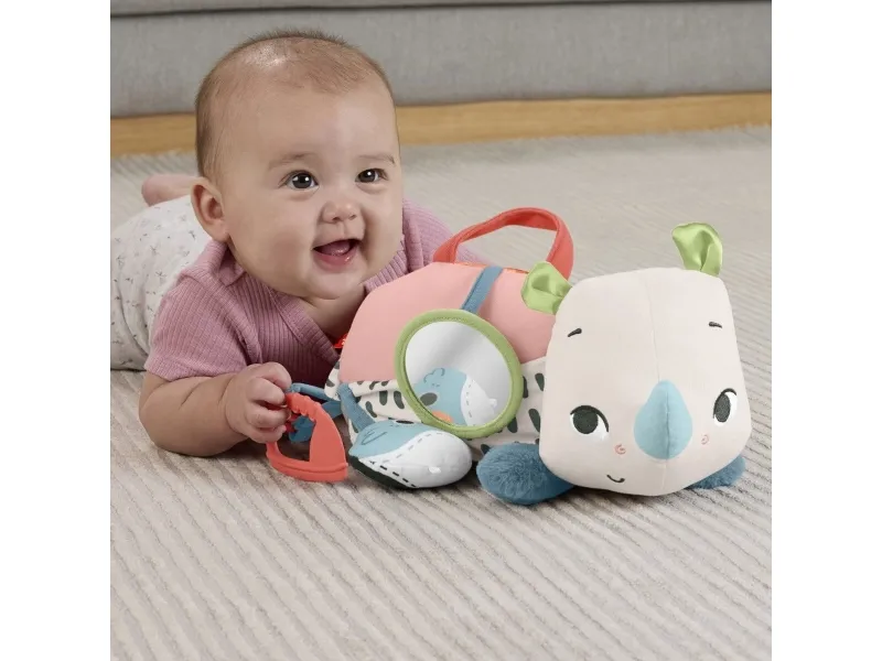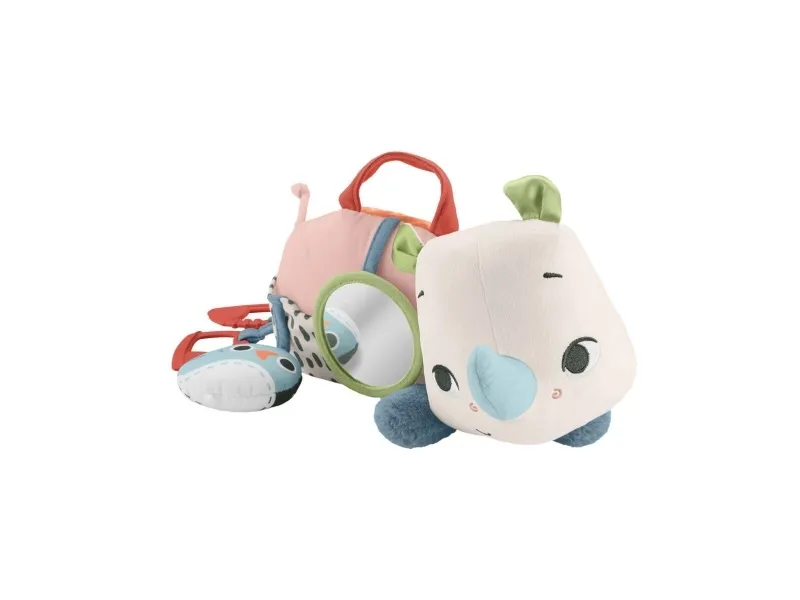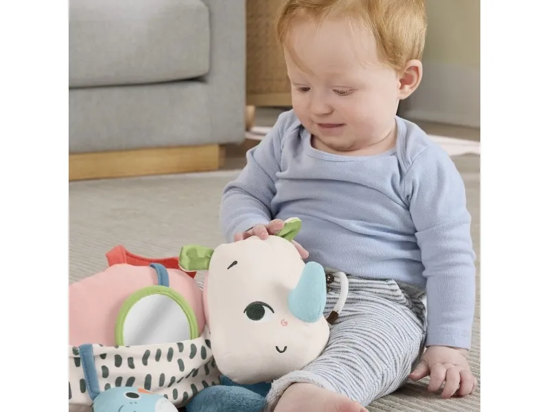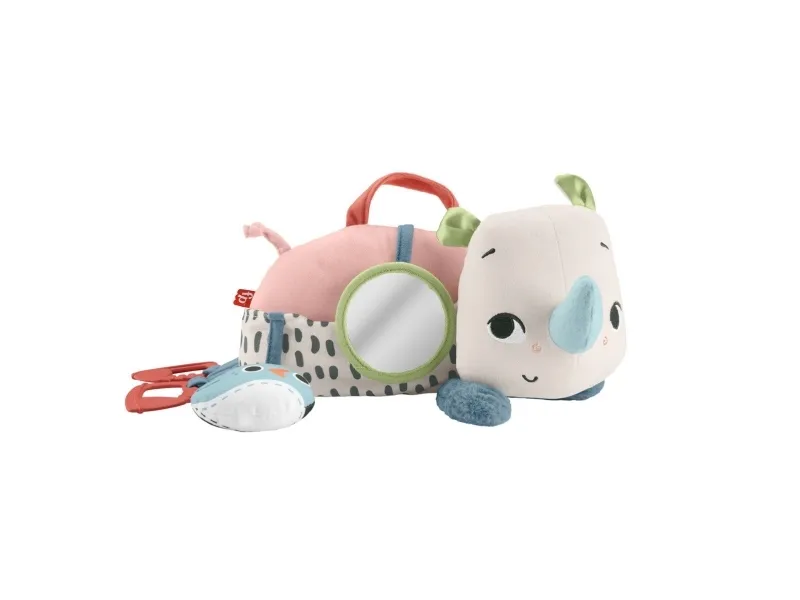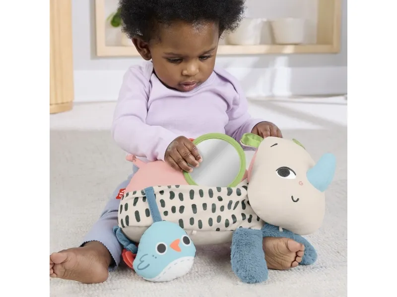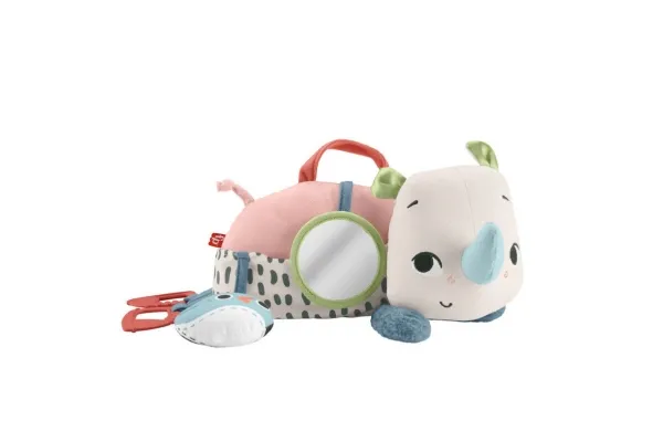 Your baby can embark on a sensory safari with the Planet Friends Tummy Time Roaming Rhino toy from Fisher-Price. Inspired by animals that are endangered or vulnerable, this rhinoceros plush toy uses fabric made from 77.46% post-consumer recycled plastics and arrives in packaging made from Forest Stewardship Council-certified paper (FSC C172210, 2021). Featuring a variety of fun textures for your baby to explore, the rhino also has a side pocket and 3 toys for put-and-take play, including a self-discovery mirror, a bird rattle and sneaker clackers. A convenient handle makes it easy to grab and go. Colors and decorations may vary.