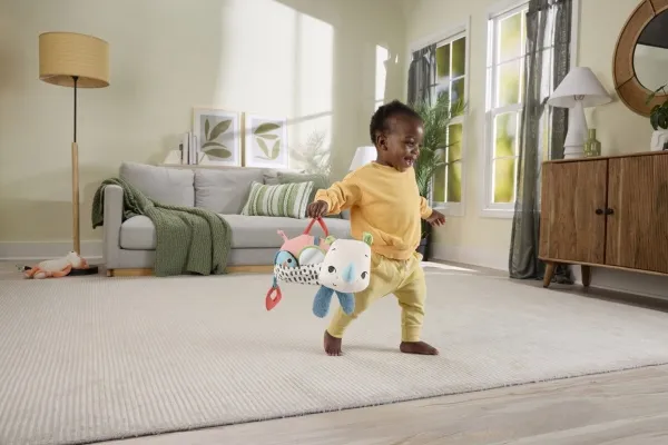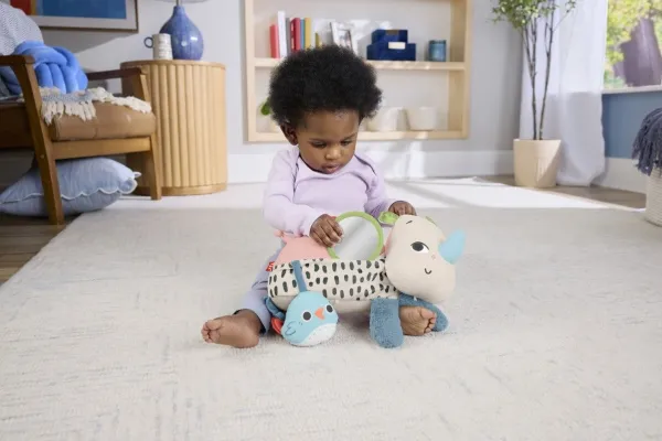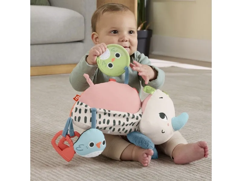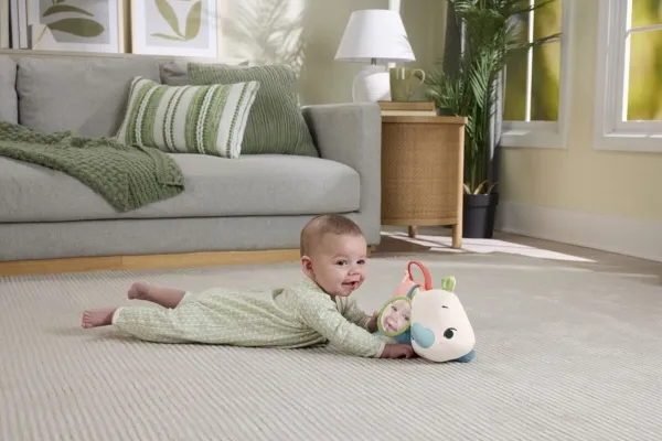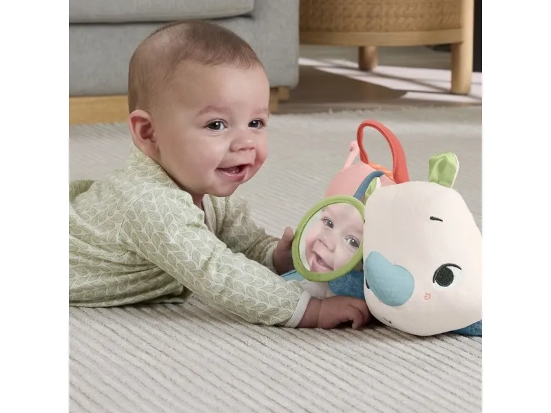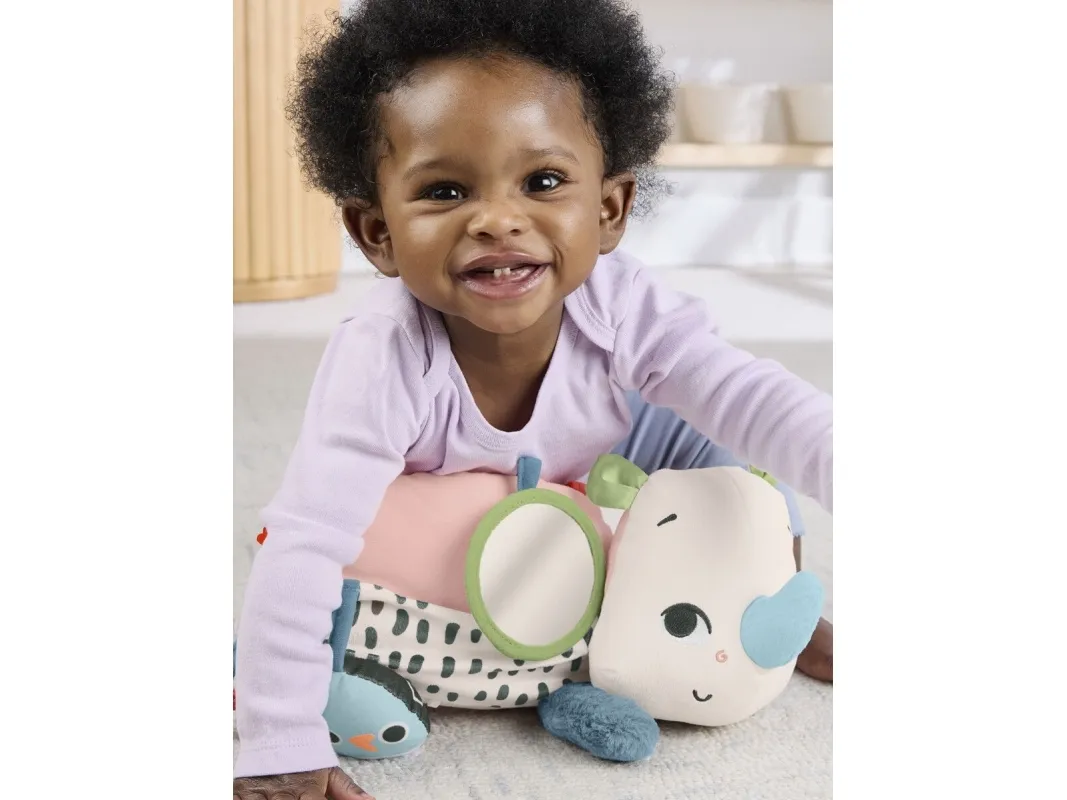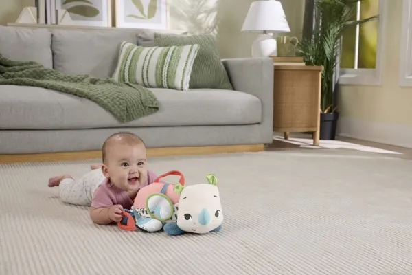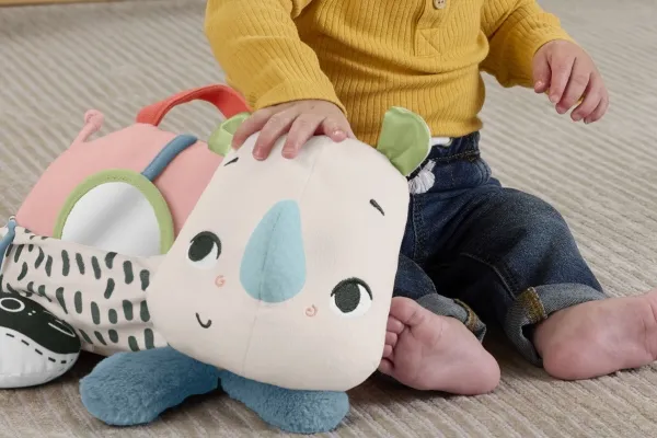 Your baby can embark on a sensory safari with the Planet Friends Tummy Time Roaming Rhino toy from Fisher-Price. Inspired by animals that are endangered or vulnerable, this rhinoceros plush toy uses fabric made from 77.46% post-consumer recycled plastics and arrives in packaging made from Forest Stewardship Council-certified paper (FSC C172210, 2021). Featuring a variety of fun textures for your baby to explore, the rhino also has a side pocket and 3 toys for put-and-take play, including a self-discovery mirror, a bird rattle and sneaker clackers. A convenient handle makes it easy to grab and go. Colors and decorations may vary.