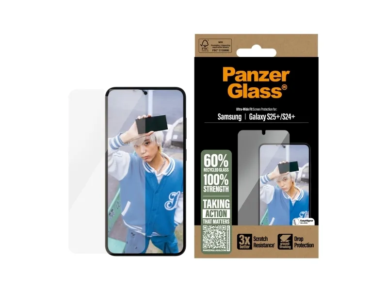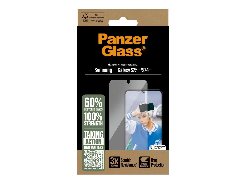 60% recycled glass. 100% strength. 100% original. With high-level scratch resistance, impressive shock-resistance capabilities, and groundbreaking drop protection, this PanzerGlass® screen protector shields your phone screen from accidental bumps, crushing falls, and other hazards of everyday life. It’s made of almost two-thirds recycled glass and even has a smudge-free coating that reduces traces of fingerprints and grease to provide you with a clear screen view. With the enclosed EasyAligner made of 100% recycled plastic, installation is a piece of cake (seriously!). To make it even easier, we’ve included step-by-step instructions as well as a QR code for quick access to our online how-to video. And remember: Once installed, you’ll never again fear your phone falling screen-first. This might not happen, but then again … it might! This screen protection prolongs the lifetime of your phone so that one day you can pass it on to someone else who will love it just as much as you do. It’s the new circle of phone life and one way of working toward a more sustainable future. Another is to use less packaging. In 2024, we reduced the amount of paper in our PanzerGlass® core product packaging design by an average of 66%*. So, of course, this product comes in a recyclable FSC™-certified box. The screen protector is Ultra-Wide Fit. This means it covers the front surface of your phone, providing a complete view of your screen while leaving a little room around the edges for a PanzerGlass® case, for example, a fearlessly fashionable case from CARE by PanzerGlass®. And if you’re thinking: “What if my camera lenses get scratched?” Well, help is just a few clicks away: Combine your screen protector and case with PanzerGlass® PicturePerfect or Hoops®. *Reduction from 2022-2024 measured by comparing selected products from the PanzerGlass® core range.PanzerGlass ® Screen Protector Samsung Galaxy S25+ | S24+ | Ultra-Wide Fit. Brand compatibility: Samsung, Compatibility: Samsung - Galaxy S25+, Samsung - Galaxy S24 Plus. Dry application. Protection features: Scratch resistant, Shock resistant. Material: Tempered glass, Polyethylene terephthalate (PET), Silicone, Product colour: Transparent. Quantity per pack: 1 pc(s)
