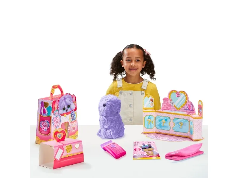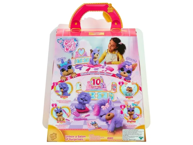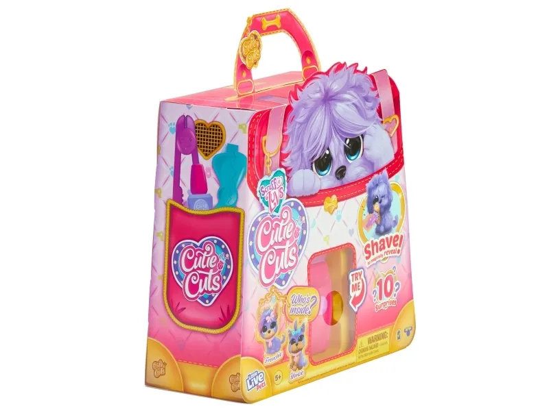 Scruff a luvs Cutie Cuts! WHY IS CUTIE CUTS SO WOW? A FULL SALON & PET GROOMING PLAYSET WITH A PRETTY PLUSH PET PAL REALLY, YOU CAN SHAVE OFF ITS FUR!!! How to groom and reveal your pet! – The Furry to Fabulous Process! Start by clipping your Pups fur, then give it a bath and a little wash, dry and brush! Now the special treat; Paint its nails on paws, style and accessorize – Ta daah! End result! WOW you are a CUTIE! Which purple Pet will you get?