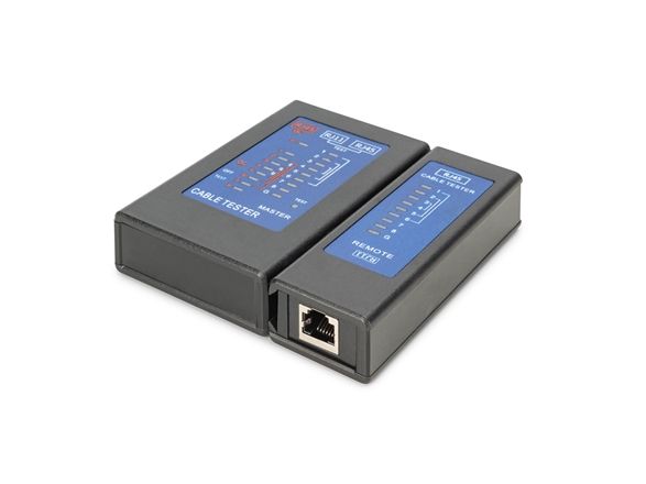 The DIGITUS DN-14001-2 network tester kit is designed for troubleshooting and testing of network cables. This device is compatible with various cable types including CAT5, CAT5e, CAT6, and CAT6a, making it suitable for networking tasks. The tester supports multiple measurements, including Power over Ethernet (PoE), continuity checks, and identification of shorts, crossed wires, signal loss, broken cables, shielding issues, and incorrect pairing. With its shock-resistant and splash-proof design, this network tester is built to withstand challenging working environments while providing reliable performance. Featuring user-friendly LED indicators, this kit ensures easy operation. The package includes both the main unit and a remote unit, allowing for flexible usage in various testing scenarios. The DIGITUS network tester kit is a practical solution for network technicians and IT professionals looking to maintain optimal network performance.