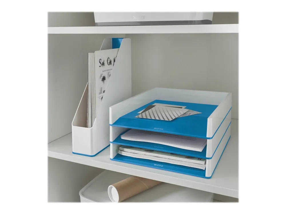 Eye-catching, premium quality Leitz letter tray in striking and stylish metallic dual colours with a high gloss finish. This robust tray perfectly complements other products from the Leitz WOW range.\n\n- Give your desk a WOW makeover with this and other Leitz WOW products in a range of striking colours\n- The most stylish Letter Tray with unique with dual colors that fit perfectly in your home interior\n- Simple organisation of documents, magazines and folders thanks to vertical stacking\n- Document tray suitable for formats up to A4, C4 as well as folio and letter sizes\n- Easy document access via the large front opening