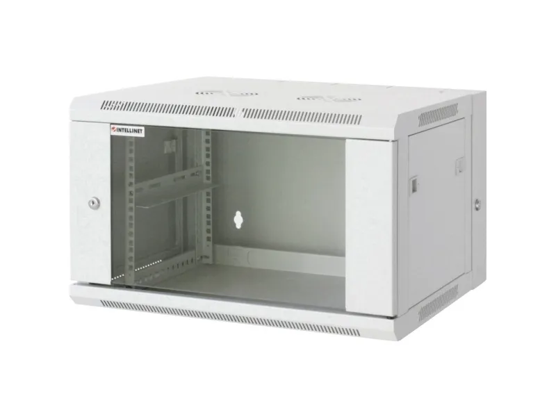 The Intellinet Network Solutions wall mount cabinets offer you a flexible and comprehensive solution for your network installations. Our service starts with the shipping condition – get the completely assembled cabinet delivered or save space and money with the flat-pack version. In terms of housing, you can choose from among the extra-compact 10? cabinets and numerous 19? versions, with installation depths that range from 300 to 600 mm. Heights from 6 to 20 units in black (RAL9005) or (RAL7021) & grey (RAL7035)._x000D_\nWe offer you a solution for every need. _x000D_\n_x000D_\nVarious options include:_x000D_\nRemovable side panels (some lockable)._x000D_\nTempered/Toughened glass doors. _x000D_\nDouble Section, making cabling and component exchange simple.\n\n- Ideal for 19" rackmount applications\n- Maximum static load of 30 kg\n- Tempered-glass door can be opened more than 180°\n- Cable entry via top panel\n- Rear door for easy access to back of cabinet\n- Cold-rolled, galvanized SPCC steel with up to 1.2 mm thickness\n- Reversible Front door\n- Easily removable side panels\n- Ships assembled\n- Three-Year Warranty