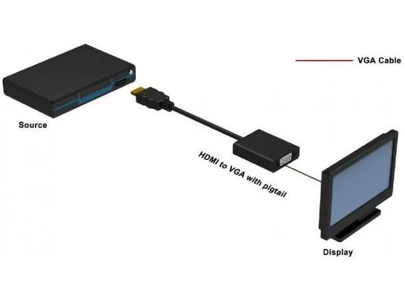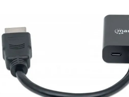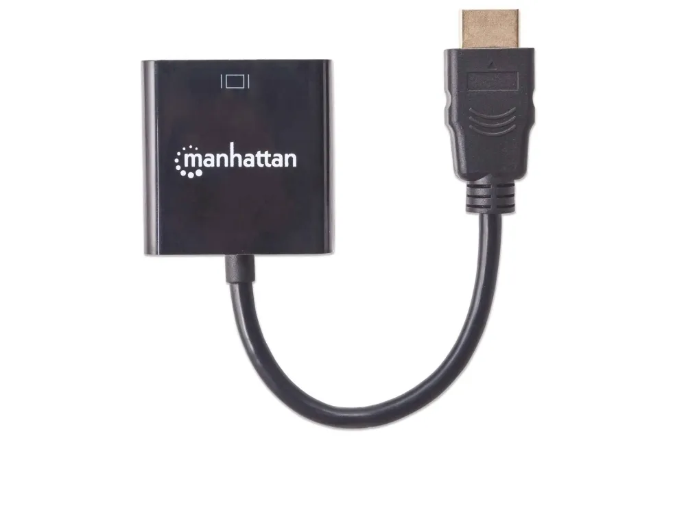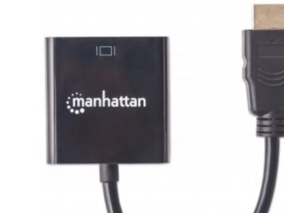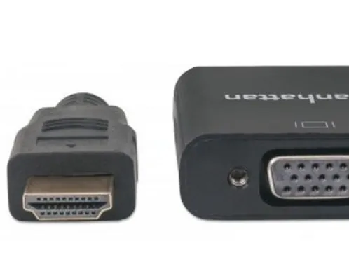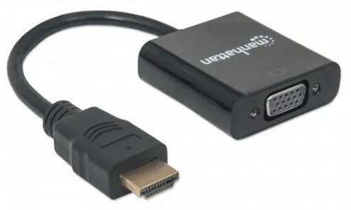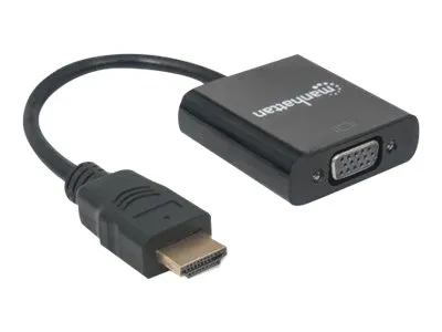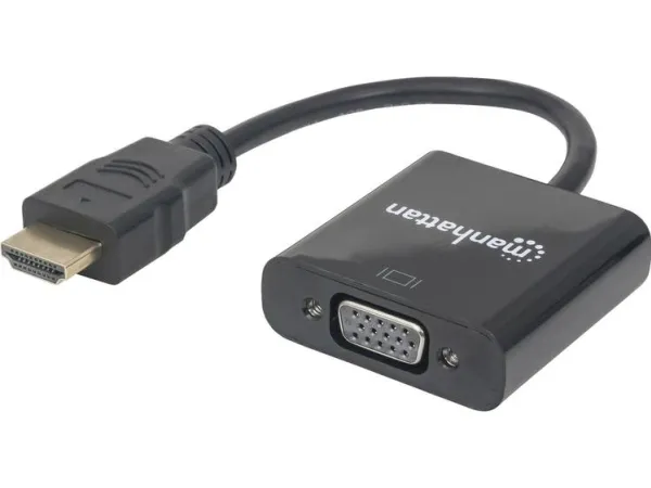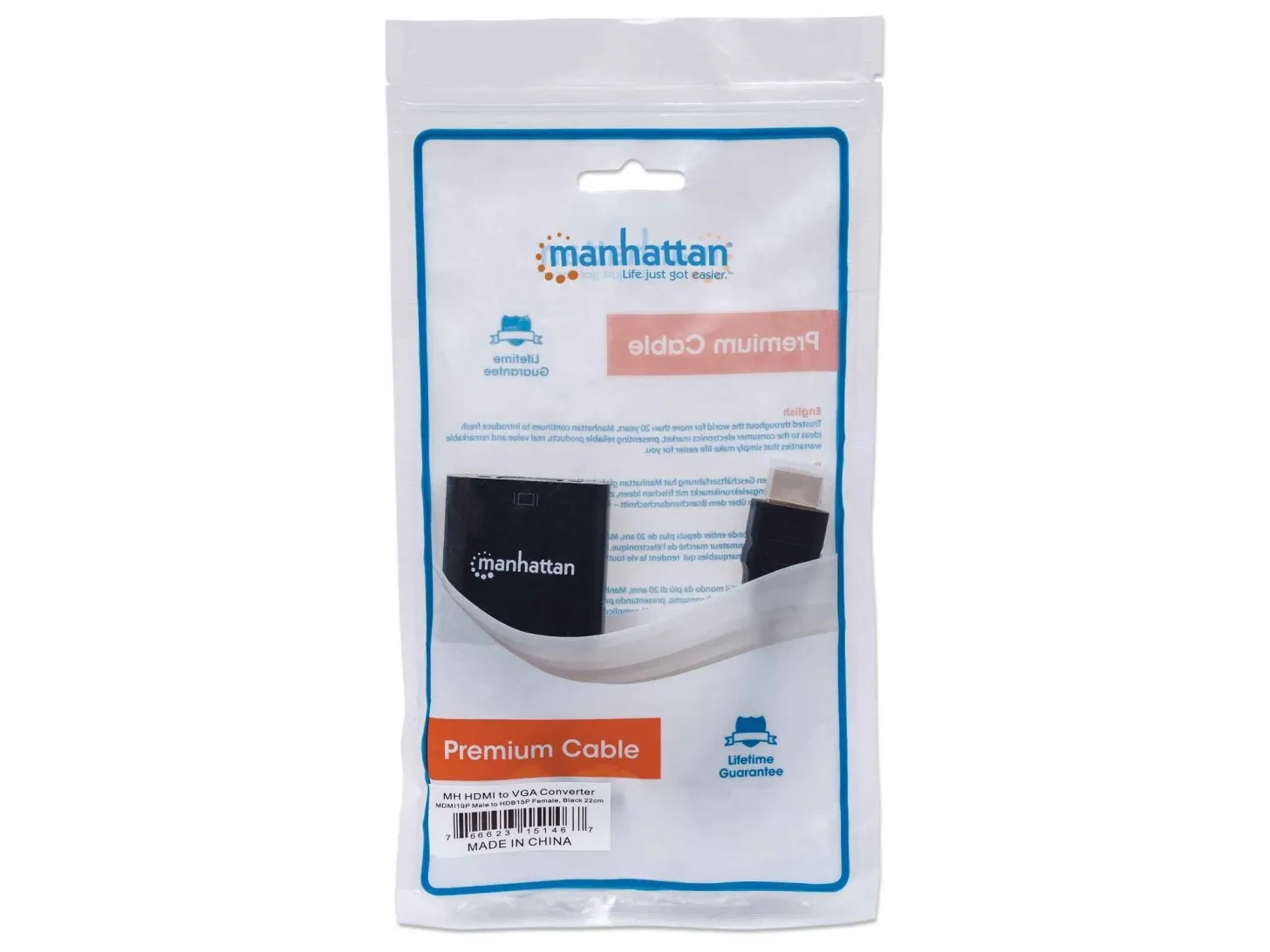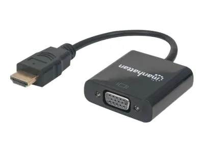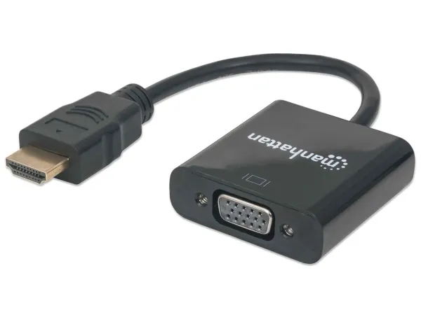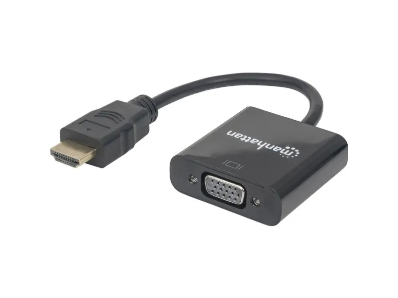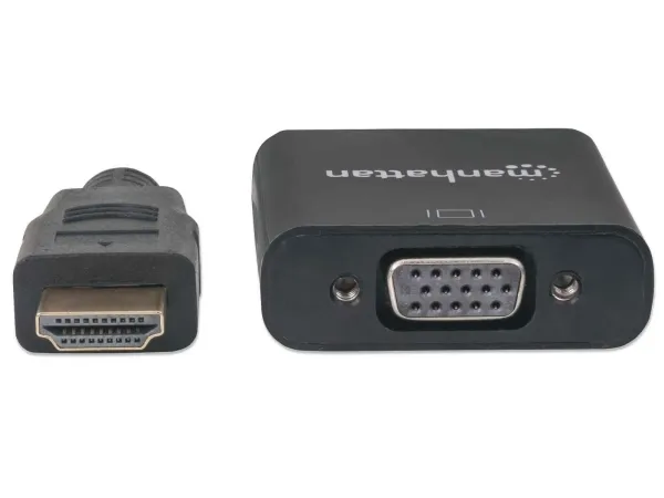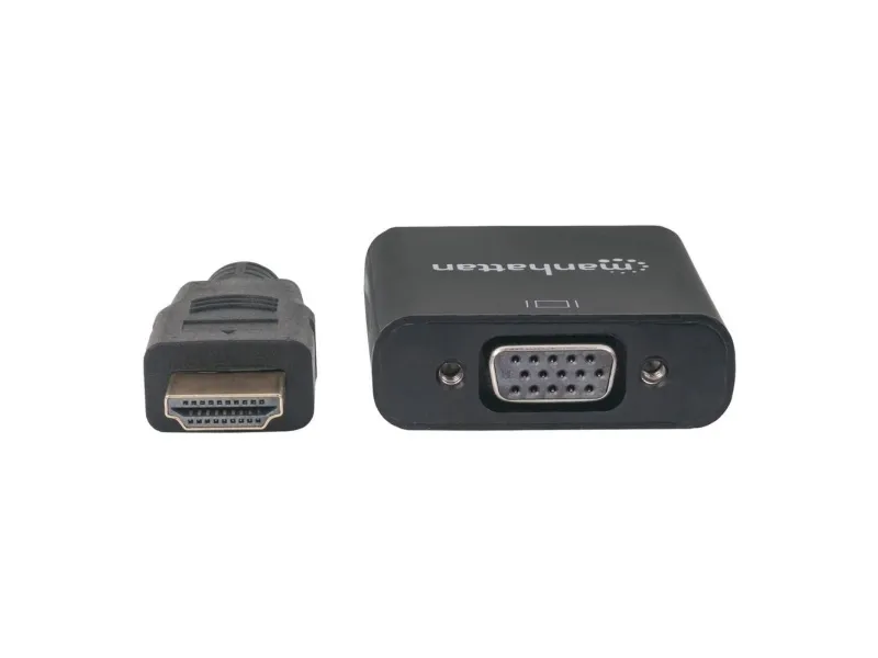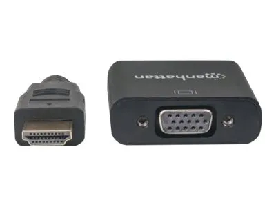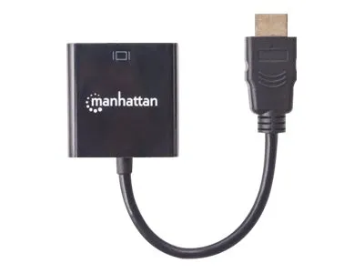 The Manhattan HDMI to VGA converter helps establish a fast, simple and convenient link between HDMI-equipped desktop and notebook computers and other media sources with existing VGA monitors, projectors and other display devices. The Manhattan HDMI to VGA converter is easy and quick to install and requires no complicated configuration or setup to help extend the service life and fully realize the investment and value of legacy VGA displays, projectors and other equipment. This low-power, cost-effective and reliable solution allows users to transition to HDMI bandwidths, resolutions, and deep color and more without the expense of upgrading to newer and costly monitors and projectors. It's integrated, all-in-one design helps achieve a compact, integrated solution that eliminates unnecessary cables, tangles and clutter to keep installations and work spaces neat and orderly.