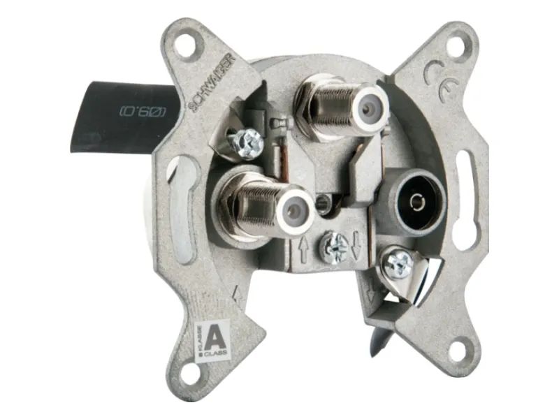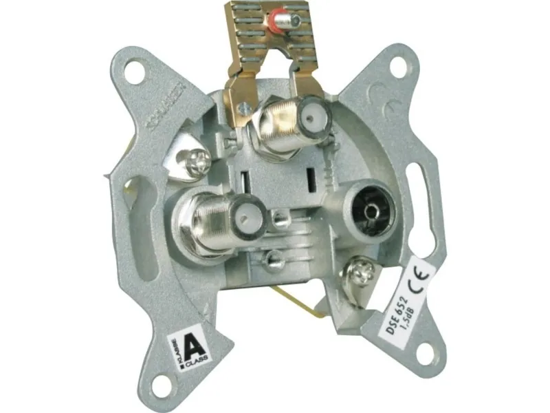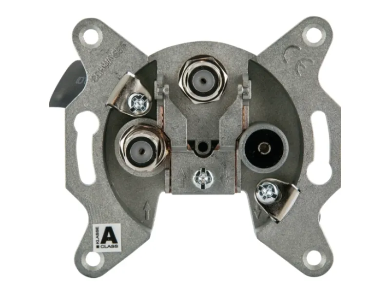 - Aufklappbare Klemmschelle zur Außenleiterbefestigung (max. 7,5 mm) - Klemmtechnik für schraublose Innenleiterbefestigung (Ø 0,4 - 1,2 mm) - Krallenbefestigung für Putzeinsätze (55 mm) - Zweikabeltechnik mit zwei F-Anschlüssen - Gleichstromdurchgang (DC) an den Anschlüssen SAT1 und SAT2 - Normen, siehe Konformitätserklärung (Support & Service)