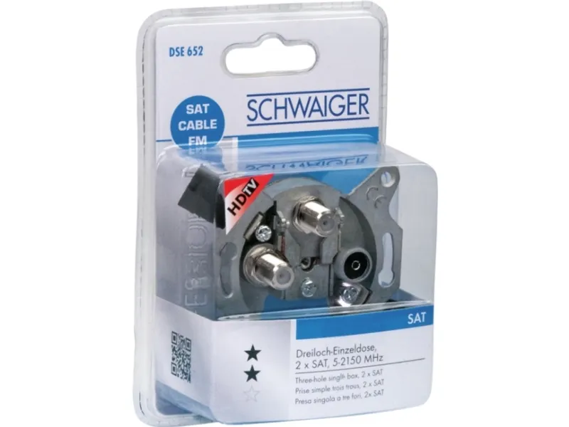Diese SCHWAIGER® Einzeldose ist für den Einsatz an Einzel-, Gemeinschaftsantennen, Breitbandkabel- und SAT-Anlagen geeignet. Die Besonderheit dieser Dose liegt in der Zweikabel- und Klemmtechnik. Bei der Zweikabeltechnik handelt es sich um zwei getrennte F-Anschlüsse, die unabhängig voneinander genutzt werden können. Mit der speziellen Klemmtechnik müssen die Kabelanschlüsse nicht verschraubt werden.