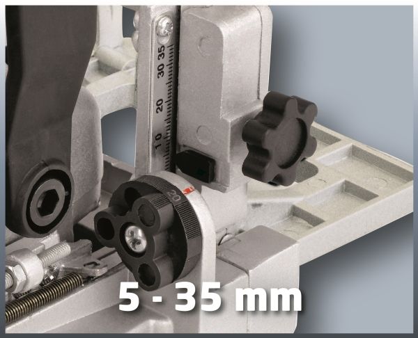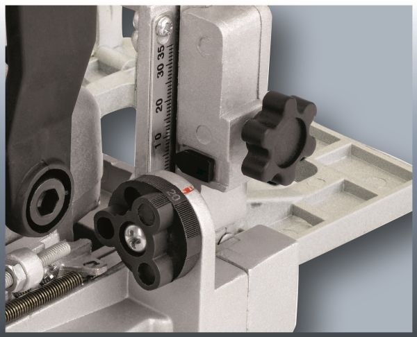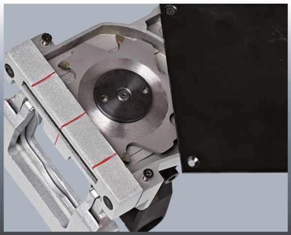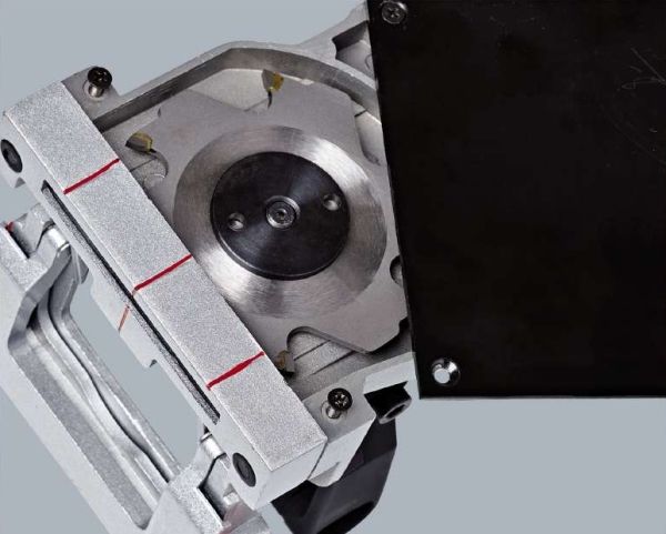 - Infinitely adjustable angle setting - Infinitely adjustable height setting - 3-step quick adjustment of cutting depth - Large base plate - Solid aluminium design - Spindle lock for easy cutter change - Face spanner for cutter change - Dust bag - Transport and storage case