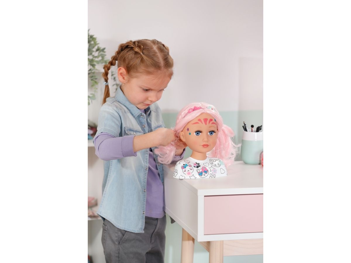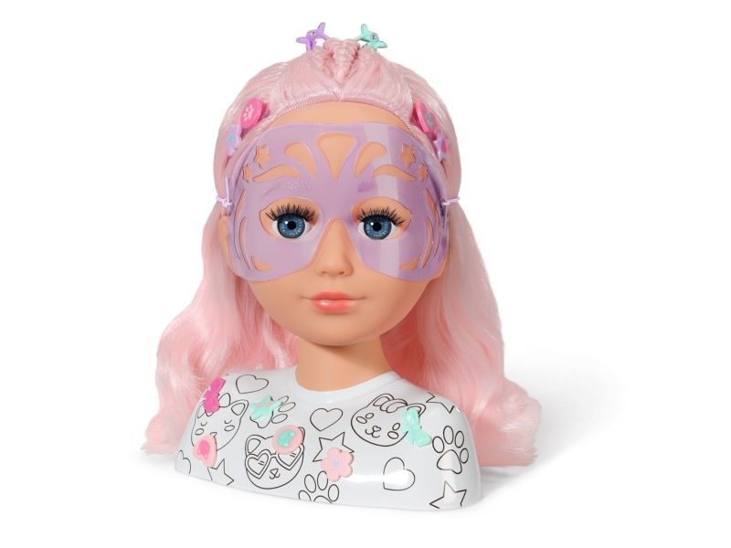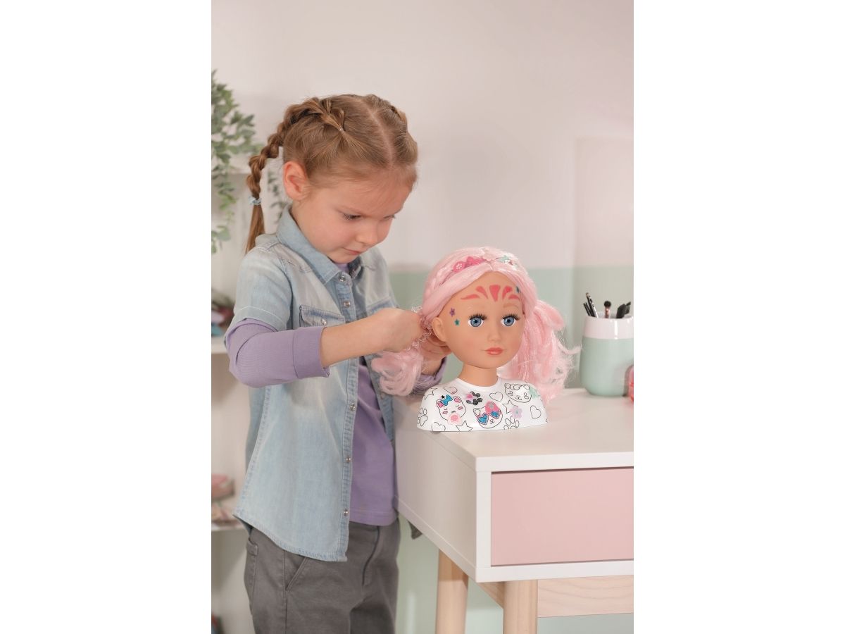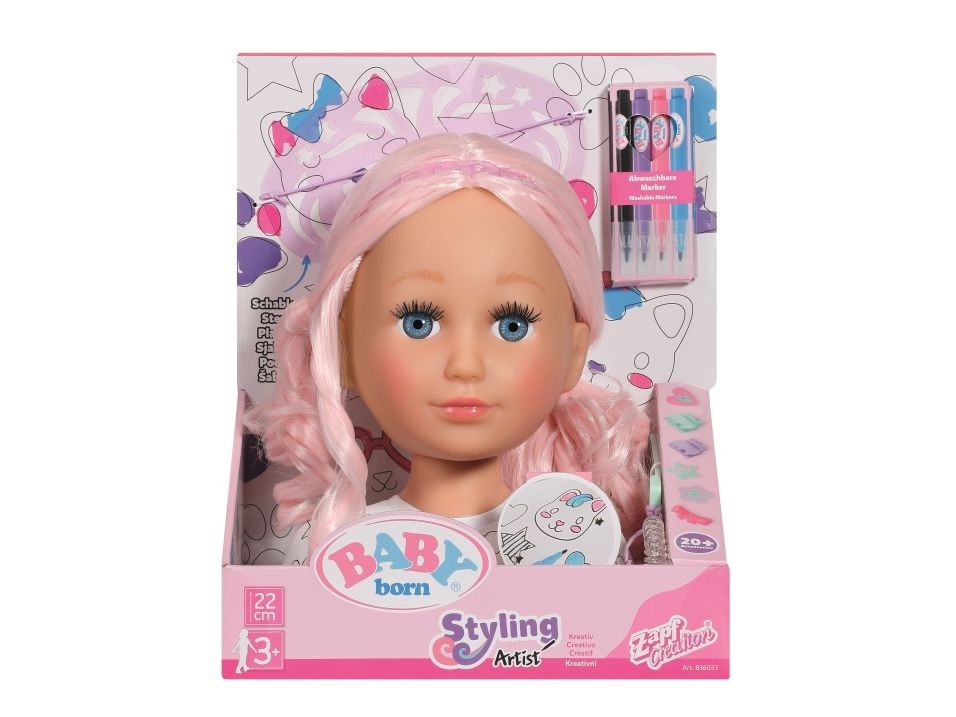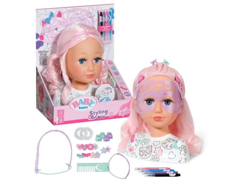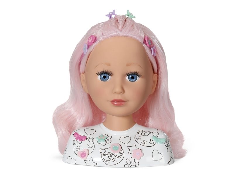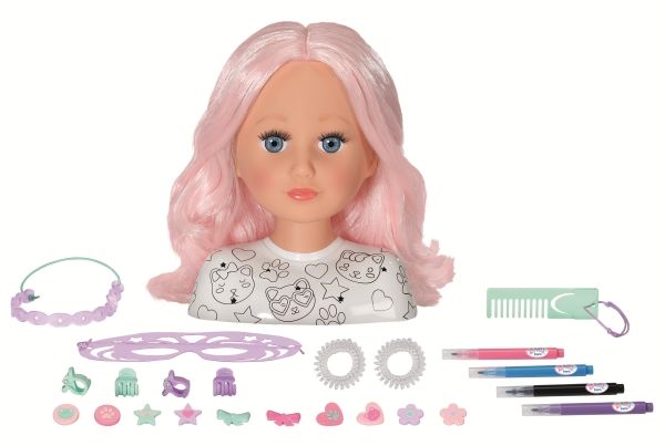 Mit dem BABY born Styling Kopf Kreativ sind der Fantasie und Kreativität keine Grenzen gesetzt. Der 22cm große Styling Kopf kann mit den beiliegenden Markern und der zugehörigen Schablone geschminkt und bemalt werden. Doch damit nicht genug: auch die Büste kann mit den bunten Markern ausgemalt und mit 10 pastellfarbenen Pins individuell gestaltet werden. Wird mal nicht mit den Markern gemalt, so können sie unter der Büste verstaut werden.Das Highlight ist natürlich das lange rosa Haar aus hochwertigem Nylon. Mit dem passenden Zubehör können die coolsten Frisuren gezaubert werden. Die Pins können dabei auch auf dem Haarband zum Einsatz kommen. • Mit hochwertigem rosa Haar aus Nylon und tollen Accessoires zum Frisieren • Mit Markern und Schablone zum Bemalen • Mit Pins zum Dekorieren der Büste und des Haarbands