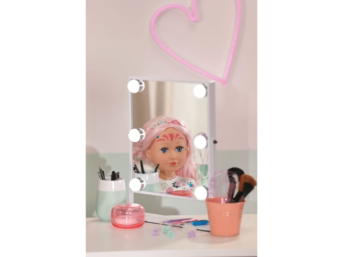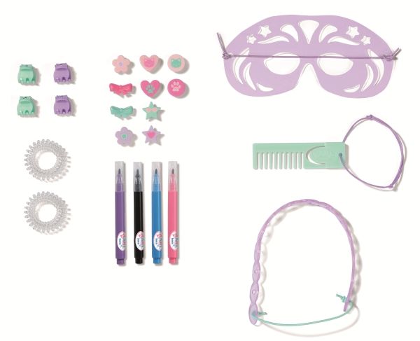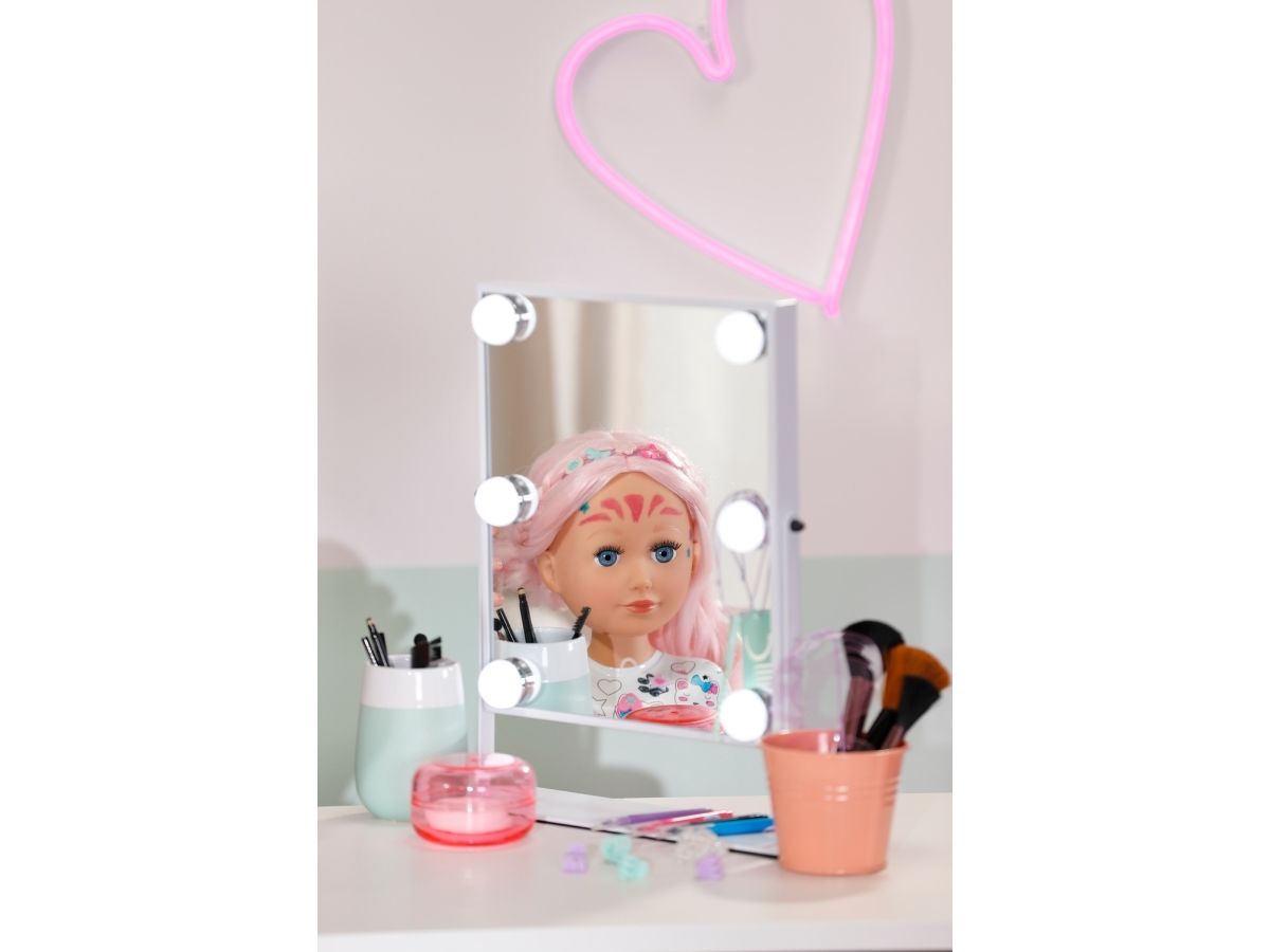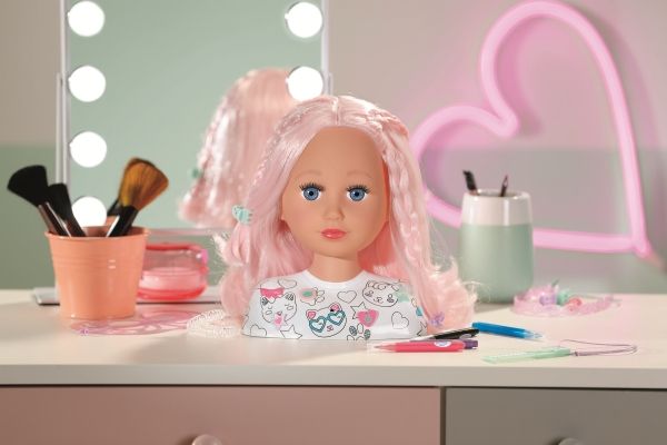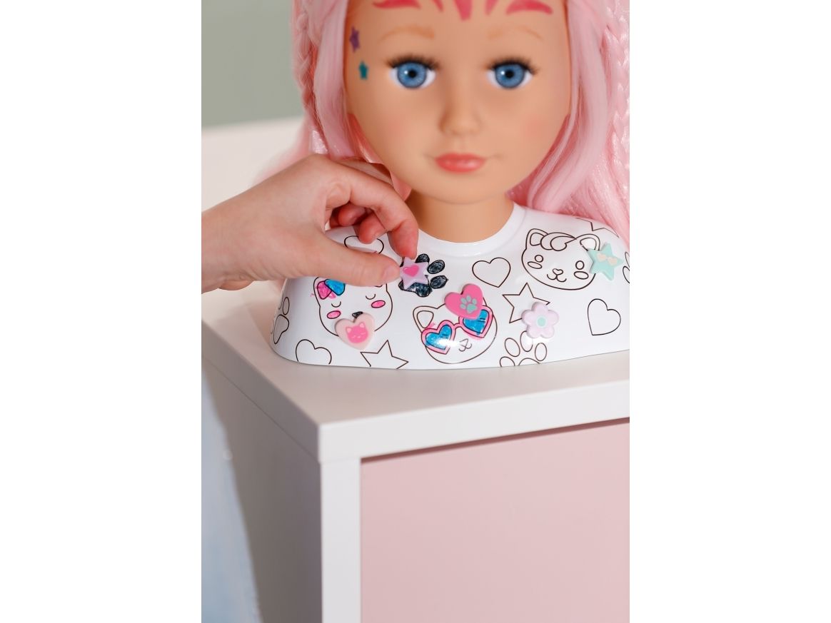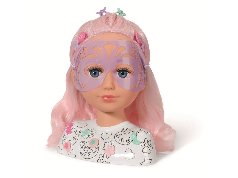 Mit dem BABY born Styling Kopf Kreativ sind der Fantasie und Kreativität keine Grenzen gesetzt. Der 22cm große Styling Kopf kann mit den beiliegenden Markern und der zugehörigen Schablone geschminkt und bemalt werden. Doch damit nicht genug: auch die Büste kann mit den bunten Markern ausgemalt und mit 10 pastellfarbenen Pins individuell gestaltet werden. Wird mal nicht mit den Markern gemalt, so können sie unter der Büste verstaut werden.Das Highlight ist natürlich das lange rosa Haar aus hochwertigem Nylon. Mit dem passenden Zubehör können die coolsten Frisuren gezaubert werden. Die Pins können dabei auch auf dem Haarband zum Einsatz kommen. • Mit hochwertigem rosa Haar aus Nylon und tollen Accessoires zum Frisieren • Mit Markern und Schablone zum Bemalen • Mit Pins zum Dekorieren der Büste und des Haarbands