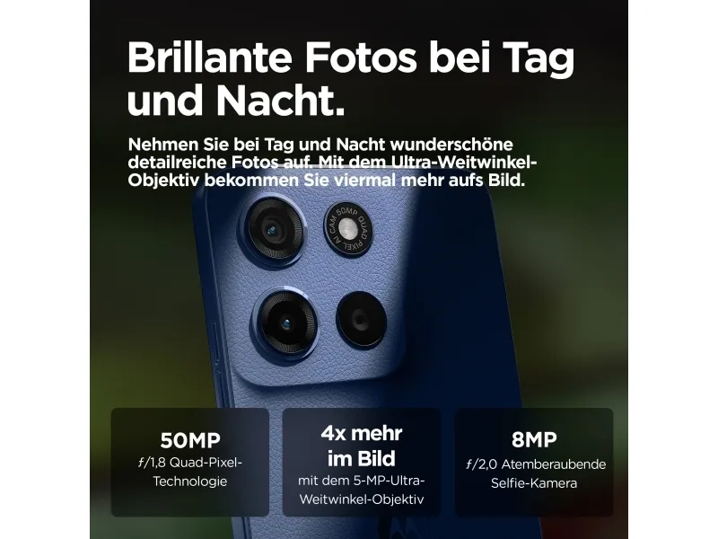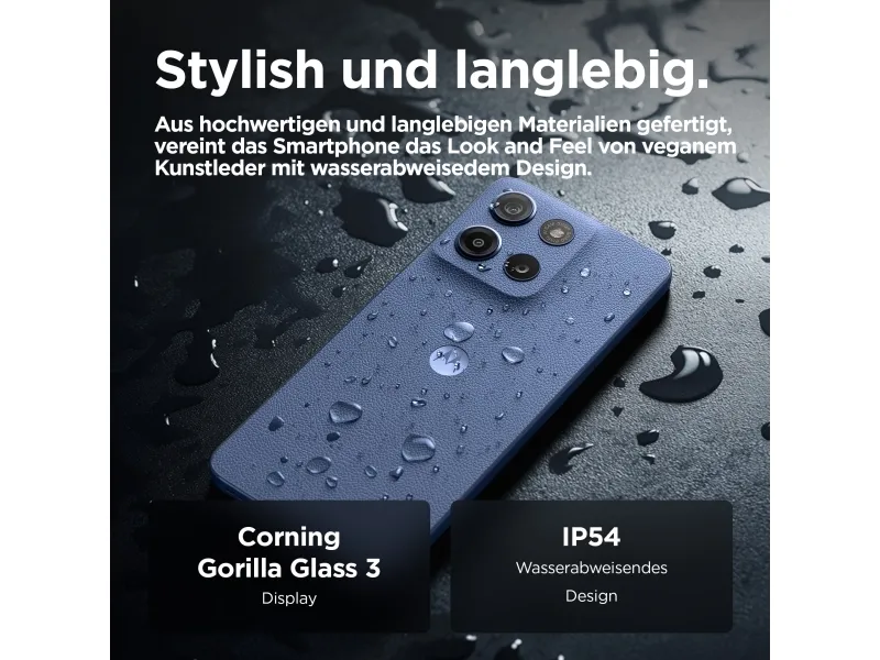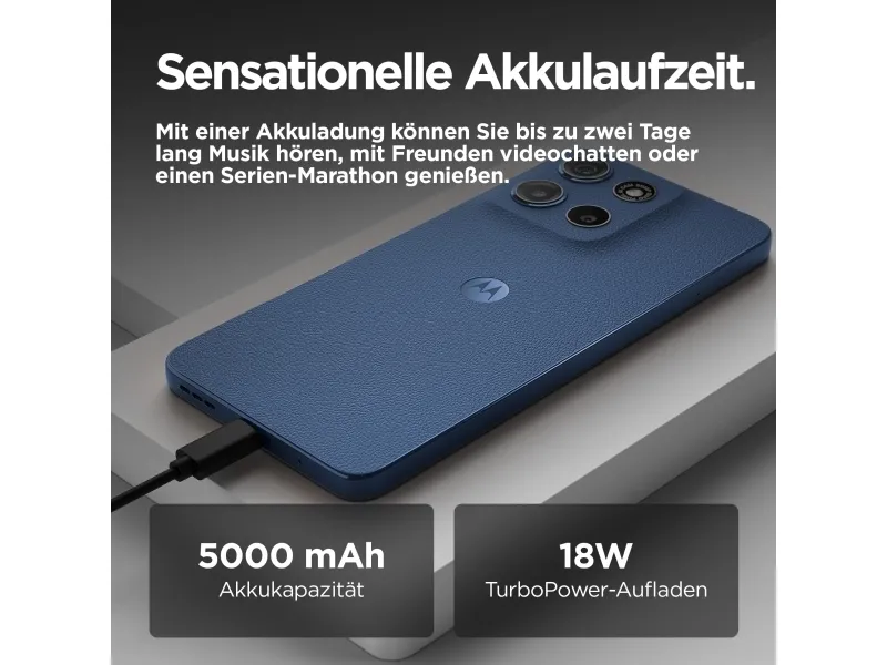 Bigger. Bolder. Brighter. moto g15 brings you cinematic entertainment at its best. Watch your favourite programmes and films come to life on a super sharp and bright 6.72” Full HD+ display – even outdoors in sunlight. Listen to sound all around thanks to powerful stereo speakers with bass boost and Dolby Atmos®. Capture beautifully detailed photos with the 50 MP(1) camera system, eliminating those annoying bars from artificial light sources. Fuel up fast with TurboPower™ charging(2) then go for longer with a 5200 mAh battery. Enjoy the premium look and feel of vegan leather, along with the protection of a water-repellent design(3) and Corning® Gorilla® Glass 3. Plus, experience fast performance and plenty of storage, so there’s always room for fun. Brighten each day with moto g15.Motorola moto g15. Display diagonal: 17.1 cm (6.72"), Display resolution: 2400 x 1080 pixels. Processor frequency: 2 GHz, Processor family: MediaTek, Processor model: Helio G81 Extreme. RAM capacity: 8 GB, RAM type: LPDDR4X, Internal storage capacity: 128 GB. Rear camera resolution (numeric): 50 MP, Rear camera type: Dual camera. SIM card capability: Dual SIM. Operating system installed: Android 15. Battery capacity: 5200 mAh. Product colour: Navy. Weight: 190 g