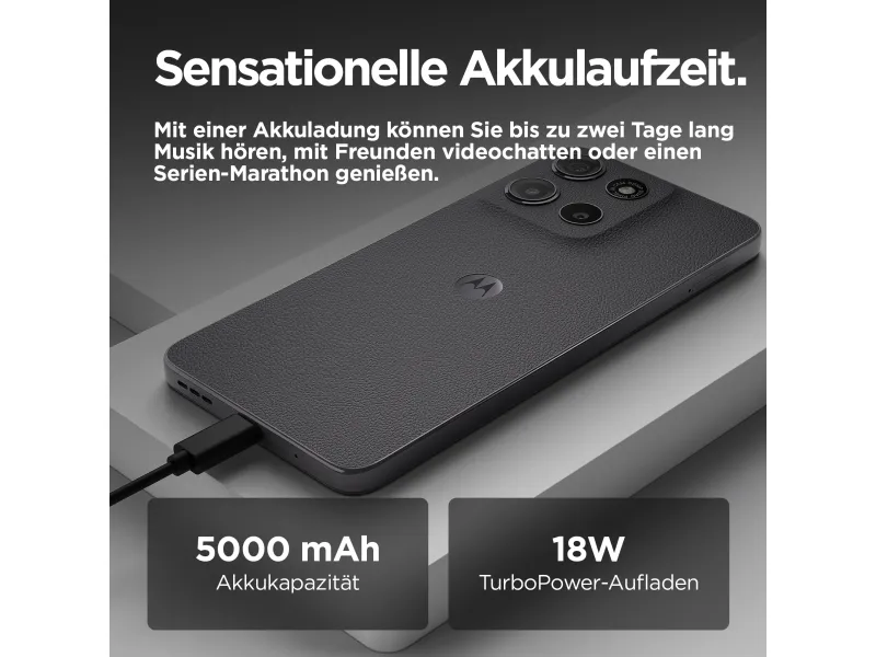 Bigger. Bolder. Brighter. moto g15 brings you cinematic entertainment at its best. Watch your favourite programmes and films come to life on a super sharp and bright 6.72” Full HD+ display – even outdoors in sunlight. Listen to sound all around thanks to powerful stereo speakers with bass boost and Dolby Atmos®. Capture beautifully detailed photos with the 50 MP(1) camera system, eliminating those annoying bars from artificial light sources. Fuel up fast with TurboPower™ charging(2) then go for longer with a 5200 mAh battery. Enjoy the premium look and feel of vegan leather, along with the protection of a water-repellent design(3) and Corning® Gorilla® Glass 3. Plus, experience fast performance and plenty of storage, so there’s always room for fun. Brighten each day with moto g15.Motorola moto g15. Display diagonal: 17.1 cm (6.72"), Display resolution: 2400 x 1080 pixels. Processor frequency: 2 GHz, Processor family: MediaTek, Processor model: Helio G81 Extreme. RAM capacity: 8 GB, RAM type: LPDDR4X, Internal storage capacity: 256 GB. Rear camera resolution (numeric): 50 MP, Rear camera type: Dual camera. SIM card capability: Dual SIM. Operating system installed: Android 15. Battery capacity: 5200 mAh. Product colour: Grey. Weight: 190 g