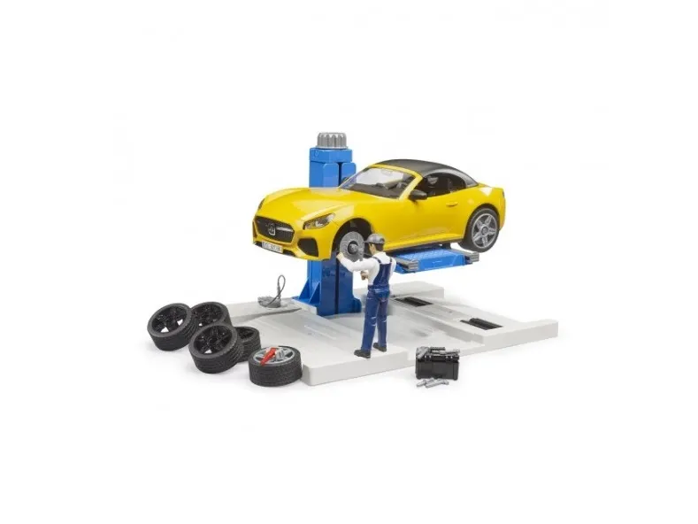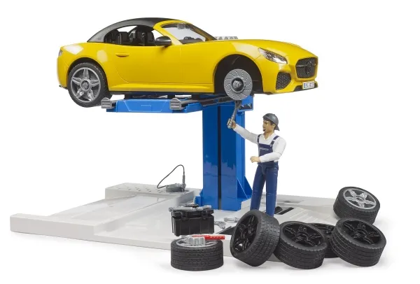 bworld, das ist die Spielwelt von BRUDER. Diese besteht aus beweglichen Figuren, Tieren, Zubehören und neuestens auch aus Themensets und ist den bekannten BRUDER Kategorien zugeordnet. Ob als Fahrer, Reiter, Wassersportler, in der Krankenstation, oder Motorradwerkstatt, bworld Artikel bieten schon alleine jede Menge Spielspaß und sind die ideale Erweiterung zu den detailgetreuen Fahrzeugen. Mit den bworld Themensets taucht man noch tiefer in die Bruderwelt ein. Das neue bworld PKW Service Center ist der Anlaufpunkt für eine Vielzahl von BRUDER Fahrzeugen, die eine Inspektion benötigen. Auf der komplett höhenverstellbaren Plattform kann der mitgelieferte Mechaniker die Fahrzeuge inspizieren und auf der angebauten Prüfeinrichtung gleich die Bremsen testen. Das Ergebnis wird ihm gleich am Monitor angezeigt. Kleinere Reparaturen können sofort mit dem enthaltenen Werkzeug durchgeführt werden und zum Schluss wird der Reifendruck kontrolliert. In diesem tollen Set enthalten ist der BRUDER Roadster. Dieser hat sich für einen Reifenwechsel angekündigt. Die Ersatzräder sind ebenfalls enthalten und mit dem neuen Radwechselsystem des Roadsters ist diese Arbeit auch im Nu erledigt.
