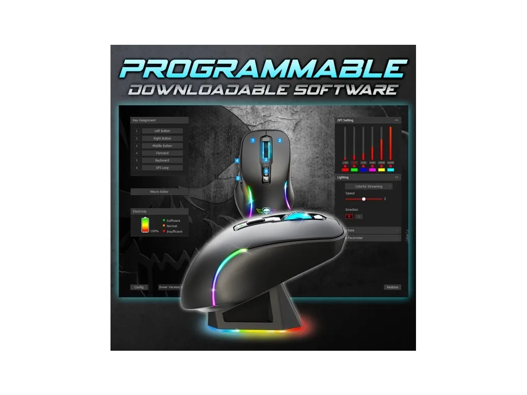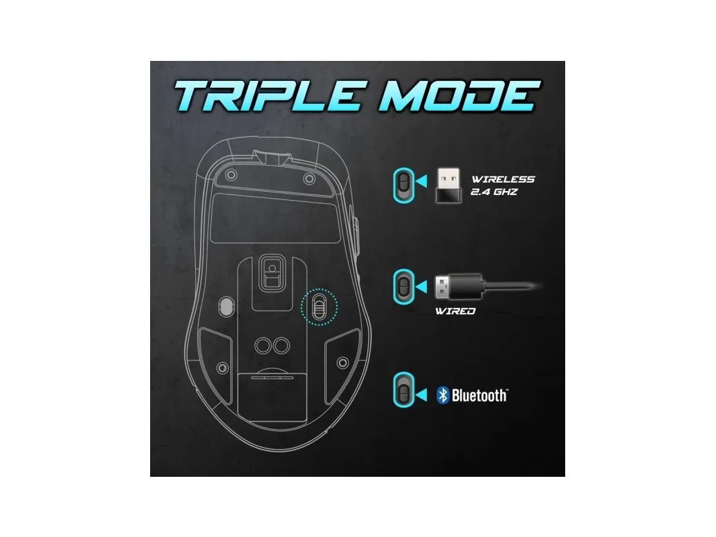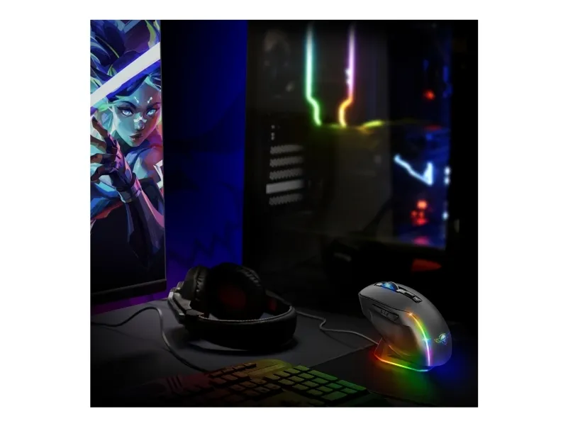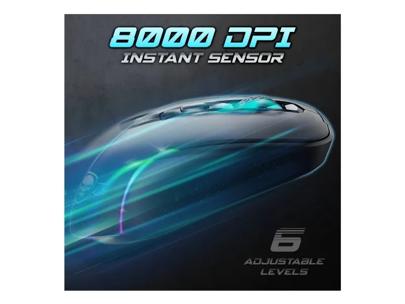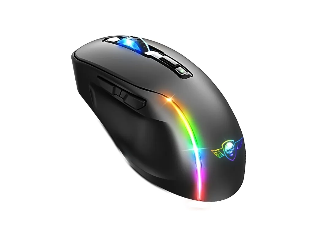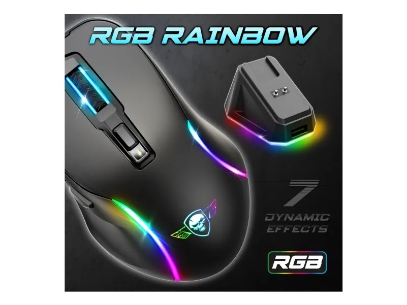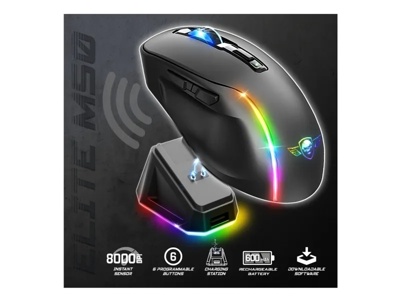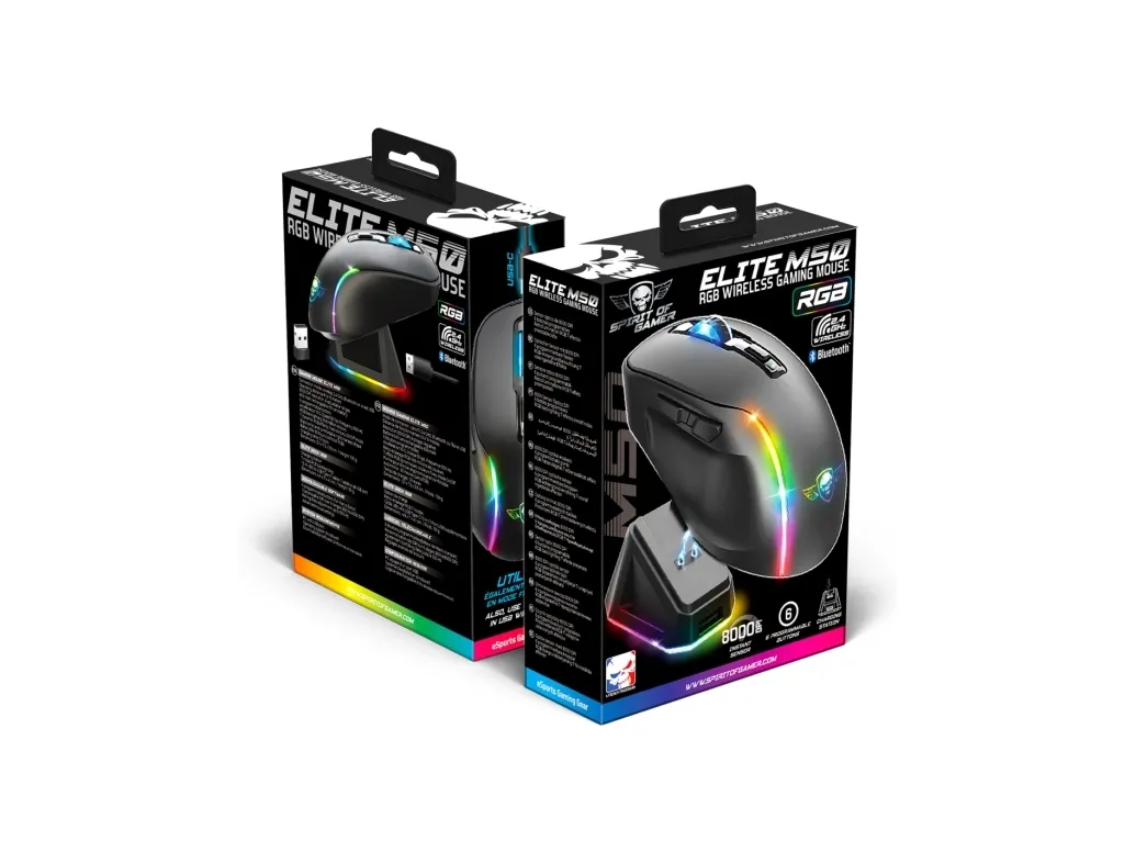 Spirit of Gamer S-EM50BK. Form factor: Right-hand. Movement detection technology: Optical, Device interface: RF Wireless + Bluetooth + USB Type-C, Movement resolution: 8000 DPI, Buttons type: Pressed buttons, Buttons quantity: 6, Scroll type: Wheel, Acceleration (max): 10 G. Illumination colour: Blue, Green, Red. Power source: Batteries/Cable. Product colour: Black