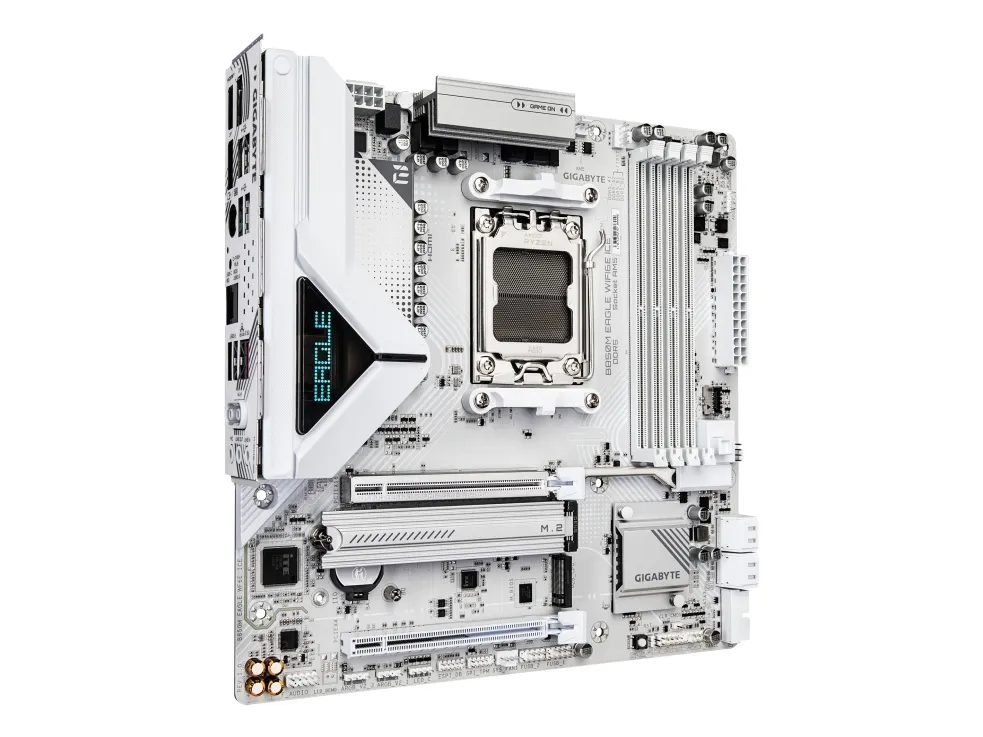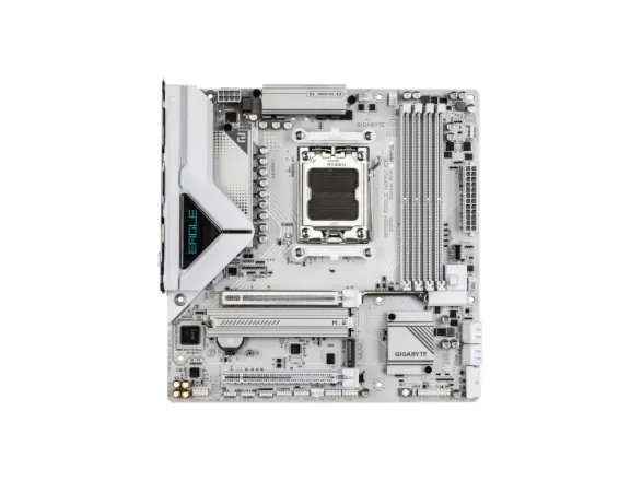 Elevate your computing experience with GIGABYTE's renowned motherboard series: AORUS, AERO, and GIGABYTE. Featuring innovative designs and advanced features, these boards offer exceptional performance and reliability. Whether you're a gamer, content creator, or professional, our series cater to your needs, ensuring uncompromising quality and cutting-edge technology.GIGABYTE B850M EAGLE WIFI6E ICE Motherboard - AMD Ryzen 9000 Series CPUs, 8+2+2 Phases Digital VRM, up to 8200MHz DDR5 (OC), 1xPCIe 5.0 + 1xPCIe 4.0 M.2, Wi-Fi 6E, 2.5 GbE LAN, USB 3.2 Gen 2. Processor manufacturer: AMD, Processor socket: Socket AM5, Compatible processor series: AMD Ryzen 7000 Series, AMD Ryzen 8000 Series, AMD Ryzen 9000 Series. Supported memory types: DDR5-SDRAM, Maximum internal memory: 256 GB, Memory slots type: DIMM. Supported storage drive interfaces: M.2, PCI Express 4.0, PCI Express 5.0, SATA III, Supported storage drive types: HDD & SSD, RAID levels: 0, 1, 5, 10. Maximum resolution: 4096 x 2160 pixels. Ethernet interface type: 2.5 Gigabit Ethernet, Top Wi-Fi standard: Wi-Fi 6E (802.11ax), Wi-Fi standards: 802.11a, 802.11b, 802.11g, Wi-Fi 4 (802.11n), Wi-Fi 5 (802.11ac), Wi-Fi 6 (802.11ax), Wi-Fi 6E...