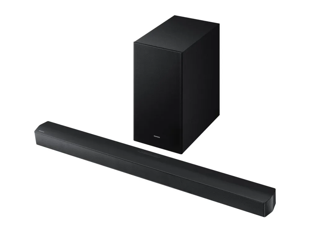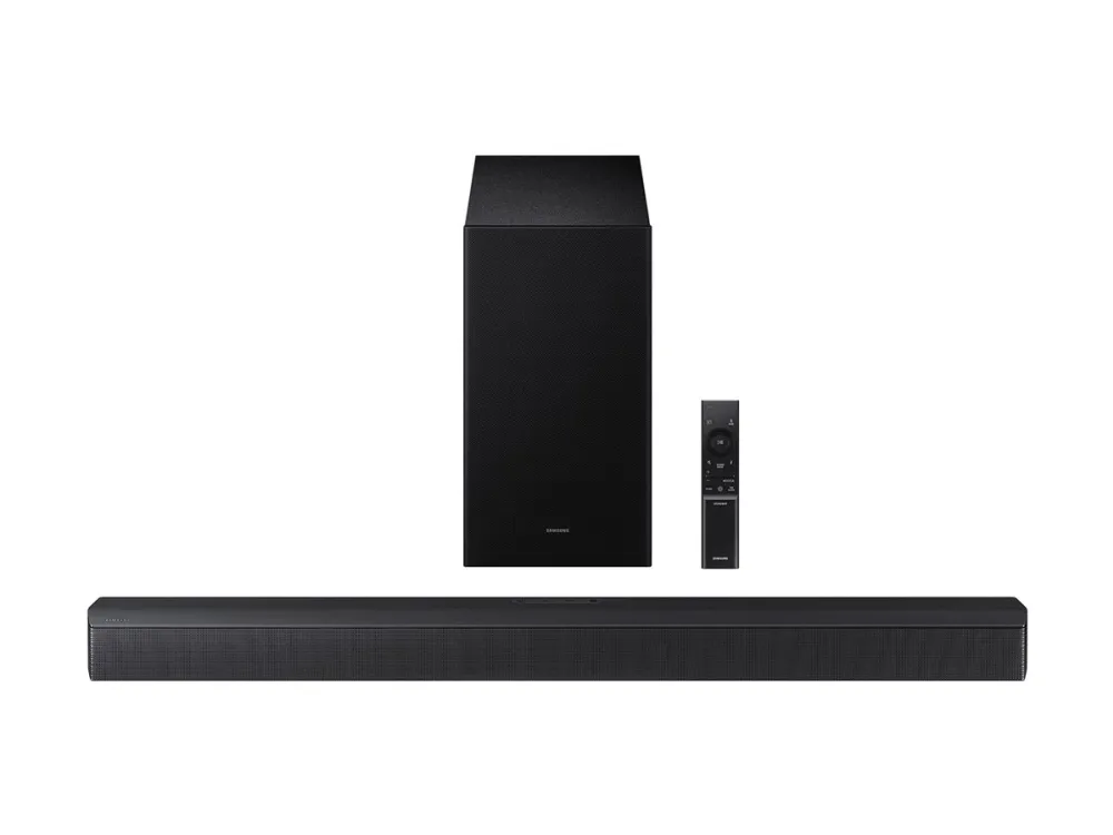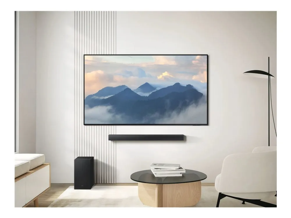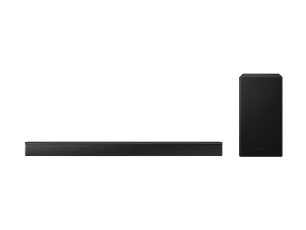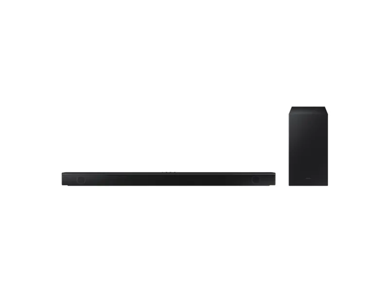 The Samsung HW-B650F sound bar system offers an audio experience designed to enhance TV viewing and provide immersive soundscapes. With a 3.1-channel configuration, including an integrated subwoofer, it delivers audio with a nominal RMS output power of 250 watts. The system supports a variety of audio formats such as WAV, AAC, AIFF, MP3, FLAC, and OGG, ensuring versatility in playback from different sources. Users can enjoy Bluetooth connectivity with version 4.2, allowing streaming from compatible devices.
