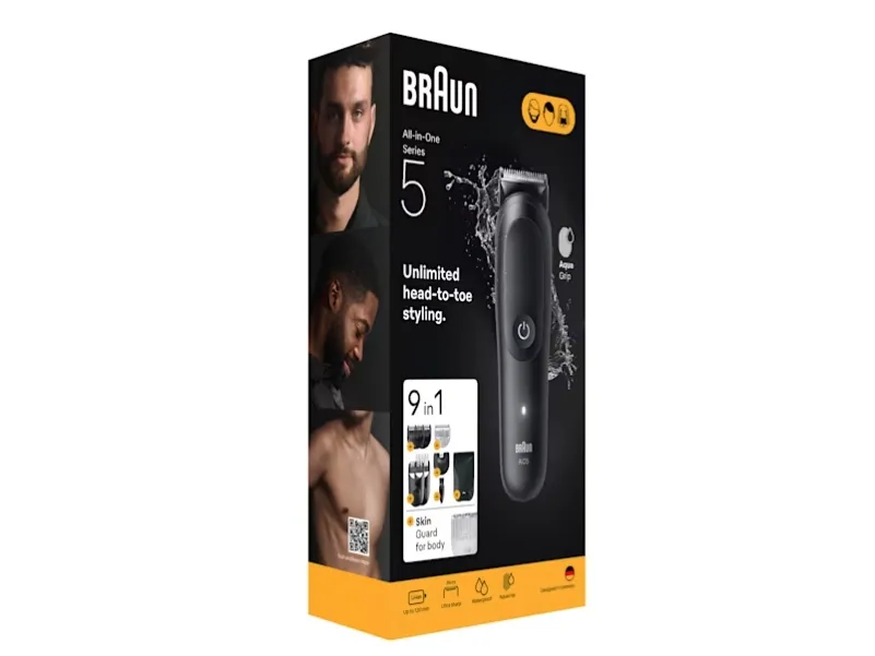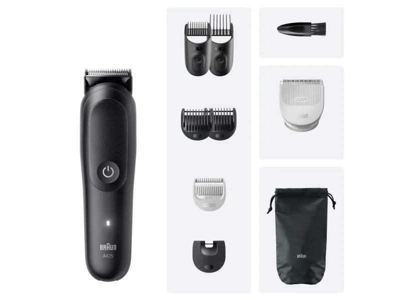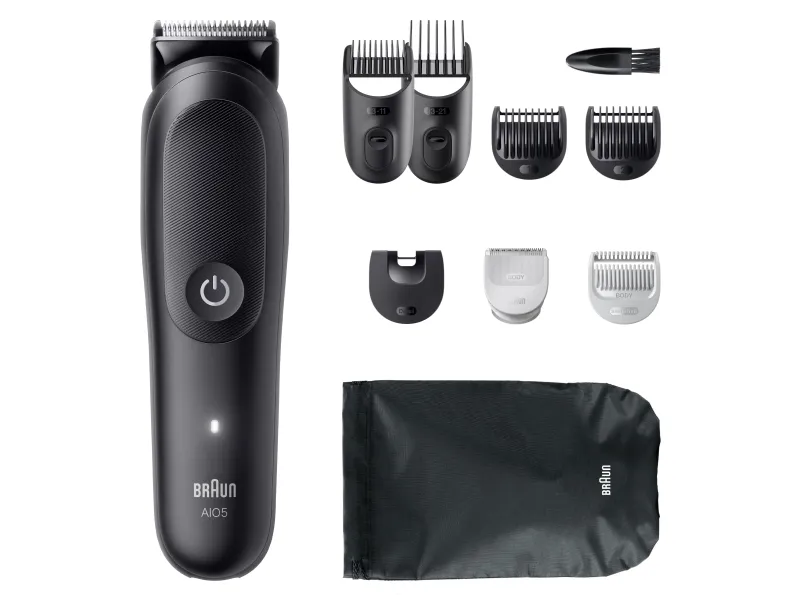 Braun AIO5540. Product colour: Black, Minimum hair length: 0.5 mm, Maximum hair length: 2.1 cm. Power source: Battery, Operating time: 120 min, Battery type: Built-in battery. Width: 42 mm, Depth: 41 mm, Height: 156 mm. Package type: Box