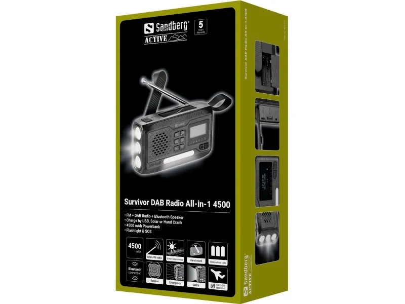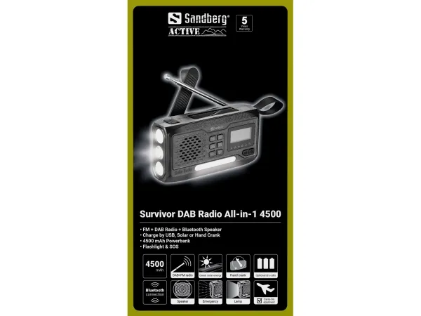 Artikelnummer: [24536852] | Produzent: Sandberg | Modell nummer: SURVIVOR DAB RADIO ALL-IN-1 | EAN: 5705730421174