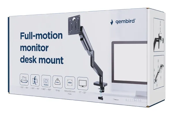 The Gembird MA-DA1-04 mounting kit offers a full-motion design that allows for flexible positioning of your flat panel display. Suitable for screens ranging from 17 to 32 inches, this desk-mountable solution enhances ergonomics by enabling adjustments in tilt, swivel, and rotation. Crafted from durable aluminum and steel, it ensures a robust hold while maintaining a sleek appearance. Integrated cable management keeps your setup tidy and uncluttered, allowing for seamless integration into any workspace.