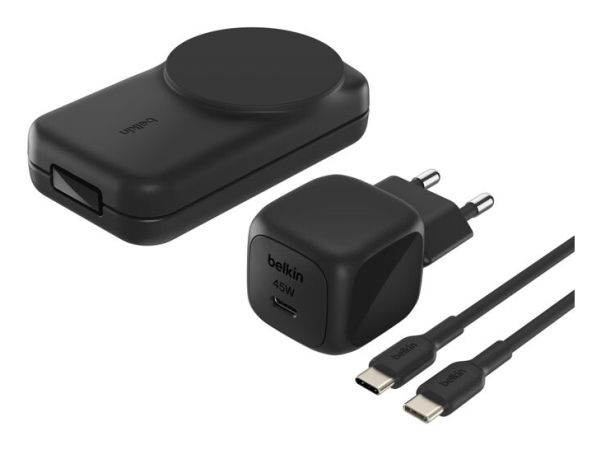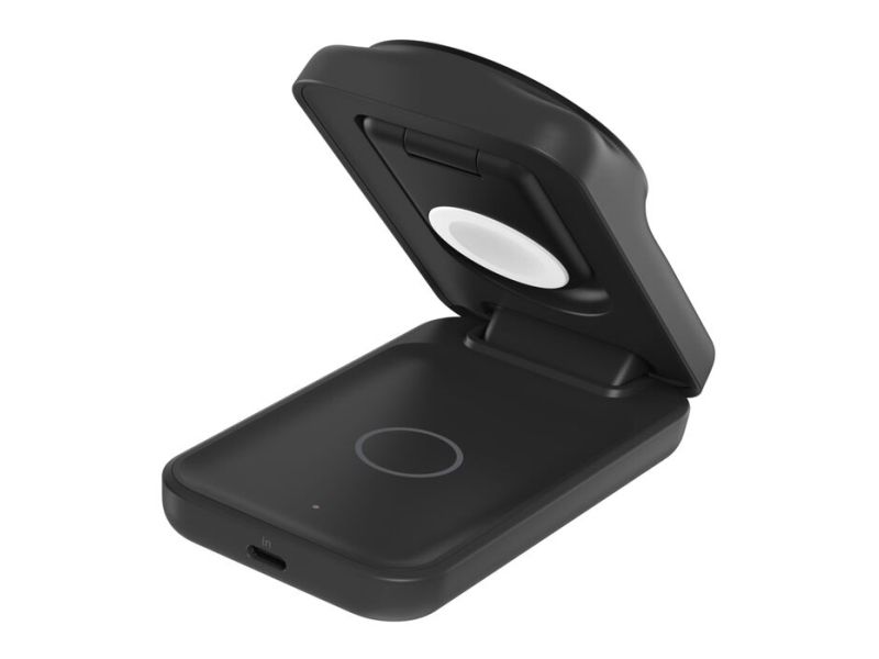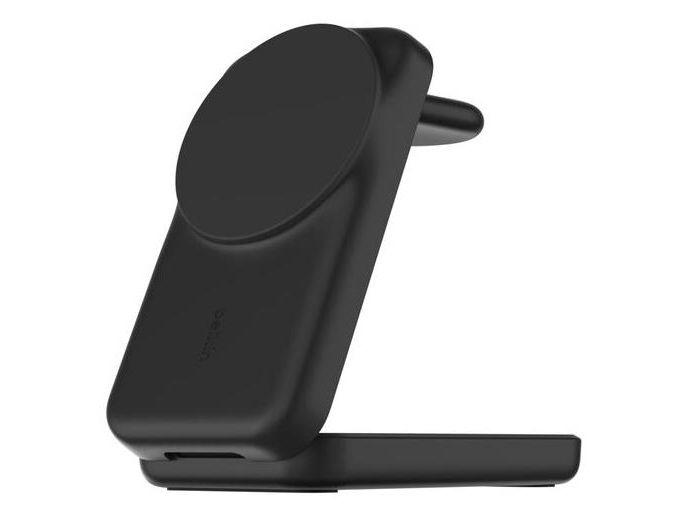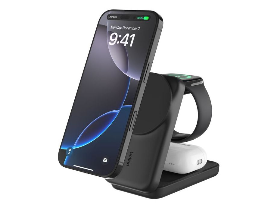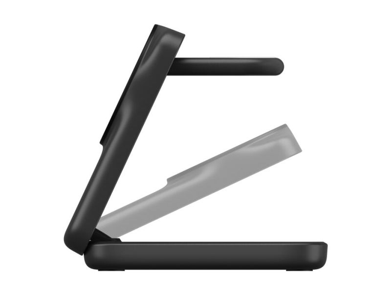The Belkin UltraCharge 3-in-1 wireless charging stand is designed to keep multiple devices powered up simultaneously. Its USB-C to USB-C cable provides flexibility with a length of 1.5 m, making it a convenient choice for any space. This charging station is compatible with cellular phones, smart watches, and wireless earphones, ensuring all your essentials are charged in one spot. Featuring a foldable design and adjustable angles, it allows for both portrait and landscape orientations, adapting to user preferences. Constructed from 85% recycled post-consumer plastic, it supports eco-friendly practices while delivering 25 W of power efficiently. With magnetic alignment and a lightweight structure, it offers ease of use and portability. The non-slip base enhances stability during charging, while ChillBoost technology prevents overheating, making it a practical solution for charging at home or on-the-go.
