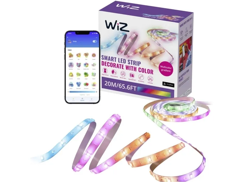 WiZ 929004126101. Type: Wall strip light, Suitable for light type: Ambience, Suitable location: Bedroom, Living room. Bulb type: LED, Total power: 36 W, Bulb lifetime: 15000 h. Input voltage: 220-240 V. Length: 20000 mm, Width: 10 mm, Thickness: 2.1 mm. Package width: 189 mm, Package depth: 82 mm, Package height: 187 mm