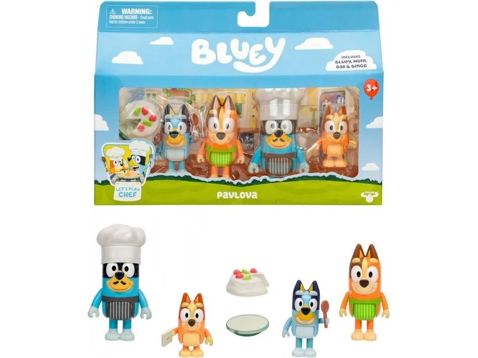 Let’s play chef with the Bluey Family playset! The Bluey Family is ready to bake delicious cakes! Includes cake stand and cake. From ages 3 and up. Are you ready to play chef with the whole Bluey Family?