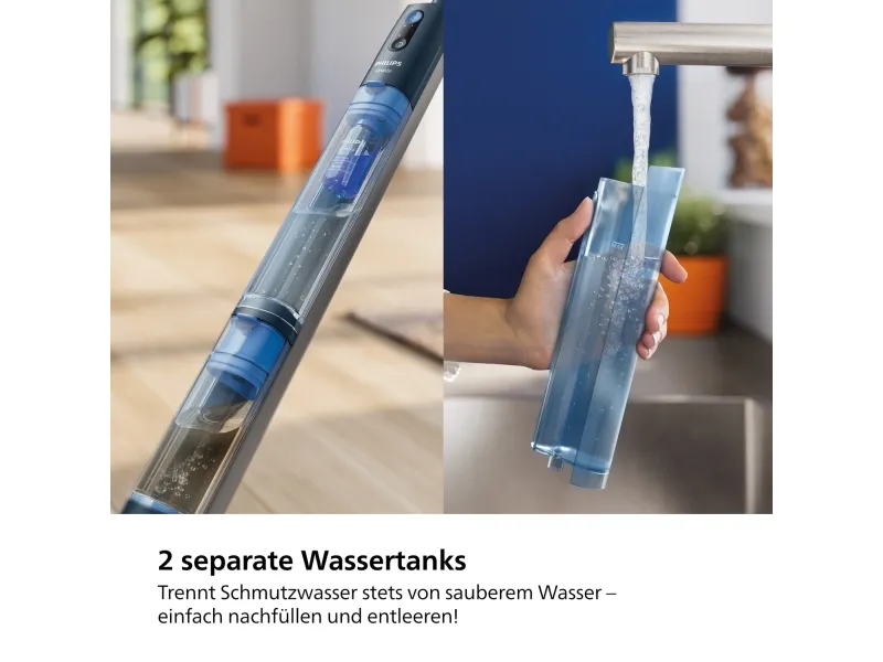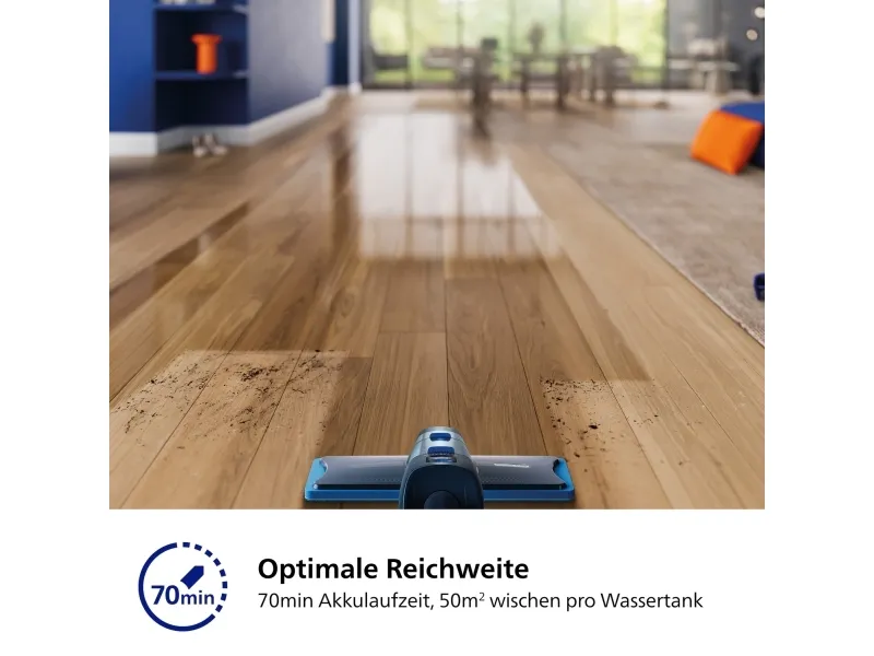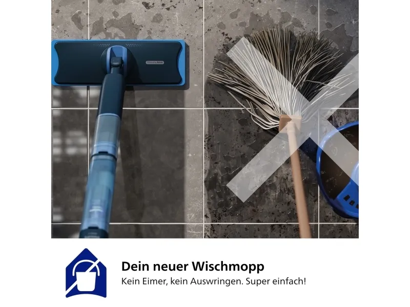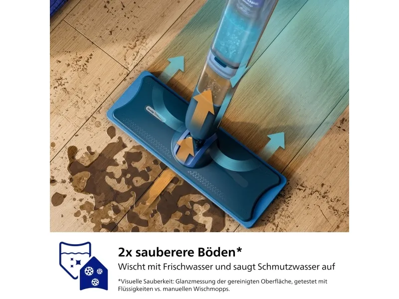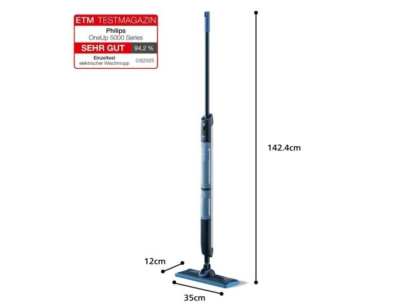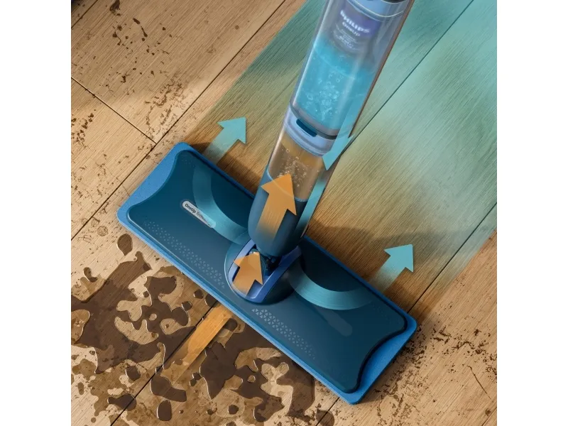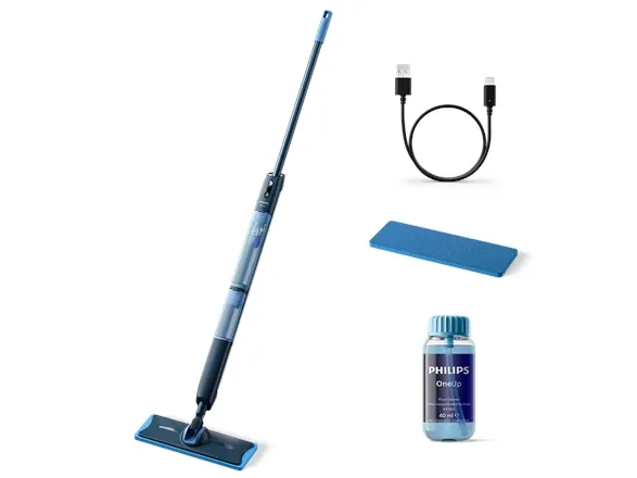 Goodbye old mop, hello oneup! Say goodbye to traditional mops that spread dirt! The Philips OneUp Electric Mop delivers 2 x cleaner floors twice as fast***. It sucks up dirty water while pumping clean water onto the floor for a spotless shine.Philips OneUp 5000 Series Electric Mop. Product colour: Blue, Clean water tank capacity: 0.281 L, Dirty water tank capacity: 0.178 L. Runtime: 70 min. Width: 350 mm, Depth: 120 mm, Height: 1400 mm. Package weight: 2.5 kg