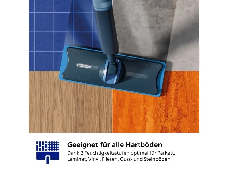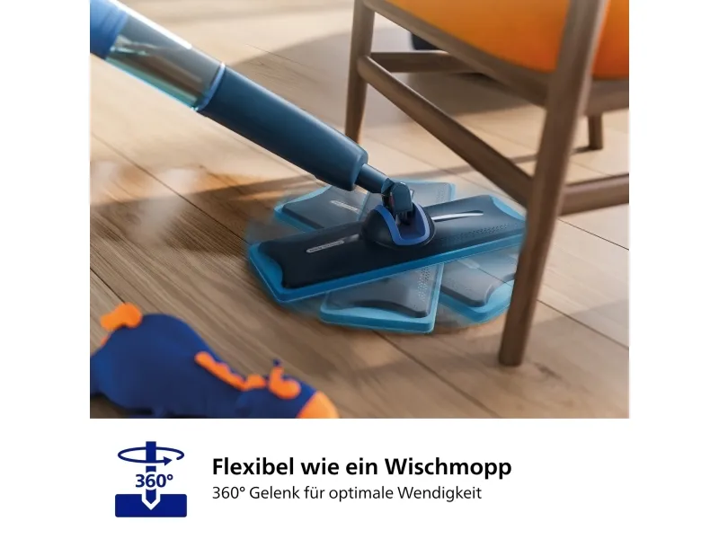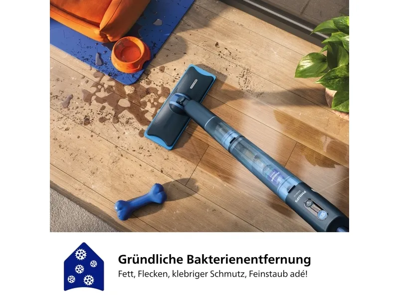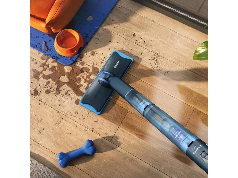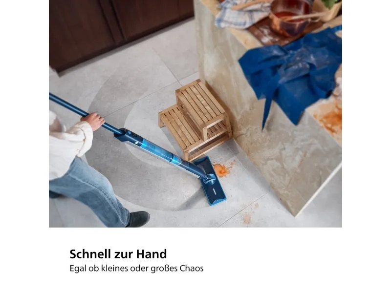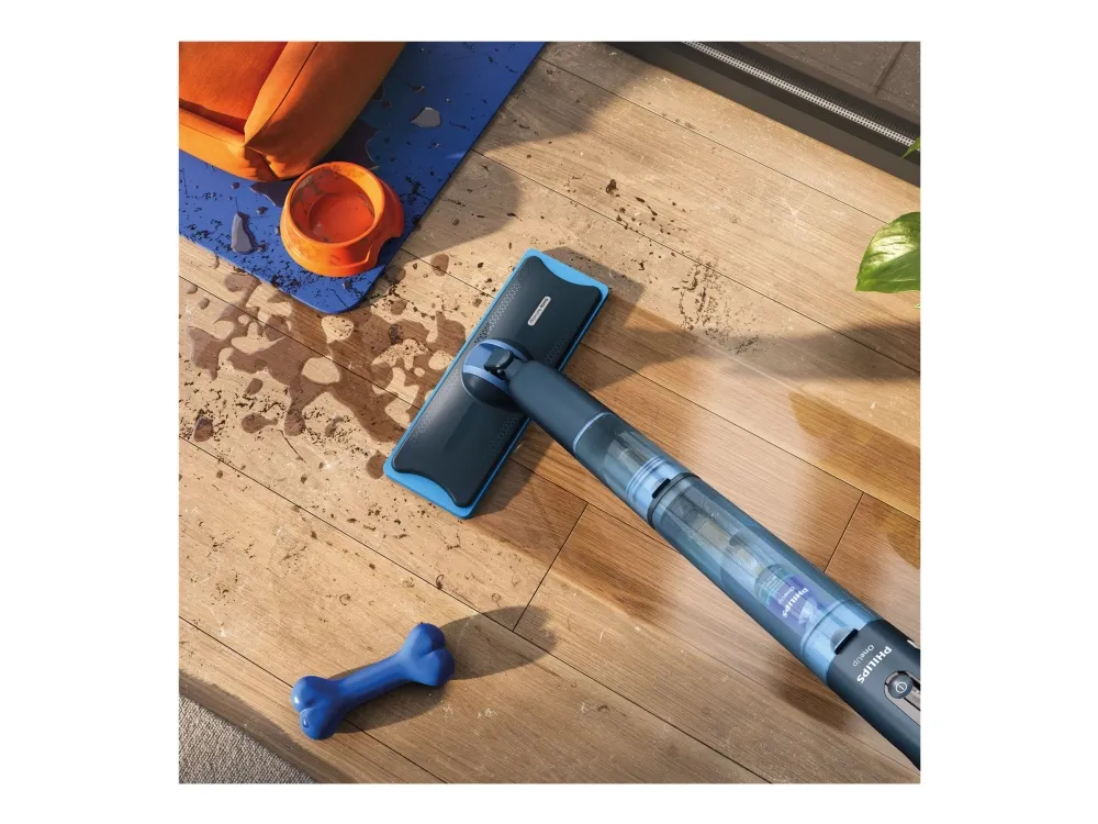 Goodbye old mop, hello oneup! Say goodbye to traditional mops that spread dirt! The Philips OneUp Electric Mop delivers 2 x cleaner floors twice as fast***. It sucks up dirty water while pumping clean water onto the floor for a spotless shine.Philips OneUp 5000 Series Electric Mop. Product colour: Blue, Clean water tank capacity: 0.281 L, Dirty water tank capacity: 0.178 L. Runtime: 70 min. Width: 350 mm, Depth: 120 mm, Height: 1400 mm. Package weight: 2.5 kg