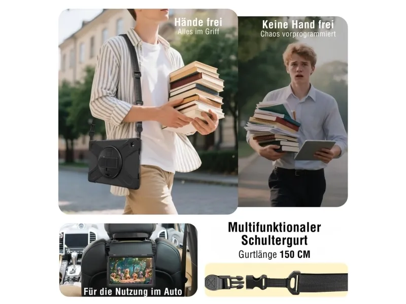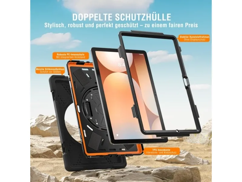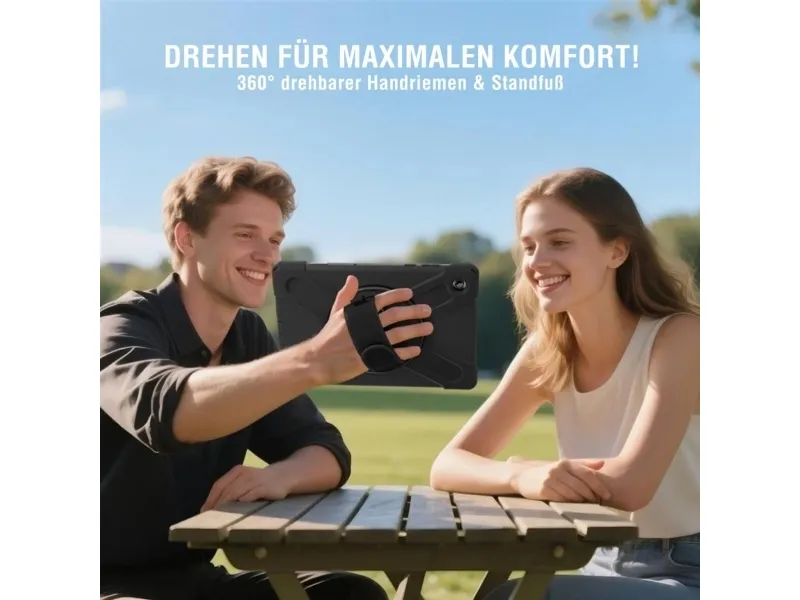 Robust Das 4smarts Rugged Case Grip bietet optimalen Schutz für dein Tablet bei Stürzen und Stößen. 360° Standfunktion Dieses robuste Markencase ist der perfekte Begleiter in jeder Lebenslage: Egal ob auf der Baustelle, im Büro oder Freizeittouren. Der Multifunktionsgriff lässt dich dein Tablet ganz einfach im Portrait- oder Landscape-Modus aufstellen. So kannst du entspannt Videos anschauen, oder mit Familie und Freunden und freien Händen in die "Face-Time" gehen. Größenverstellbare Handschlaufe Die Handschlaufe bietet Komfort und (Griff-)Sicherheit: So können absturzfrei Zeichnungen betrachtet, bearbeitet oder präsentiert, die Route durch die Stadt studiert oder auch nur die E-Mails gecheckt werden. Verschlussfähige Aussparungen Die passgenauen Bedienelemente des Rugged Case Grip für Samsung Galaxy Tab A11+ erhalten die perfekte Bedienbarkeit deines Tablets. Außerdem lässt sich die Hülle für den Rundumschutz deines Tablets ganz einfach montieren.