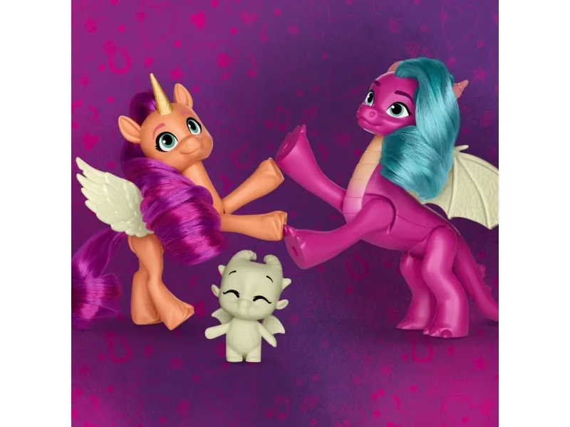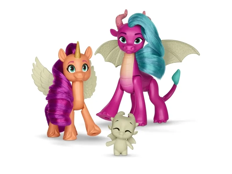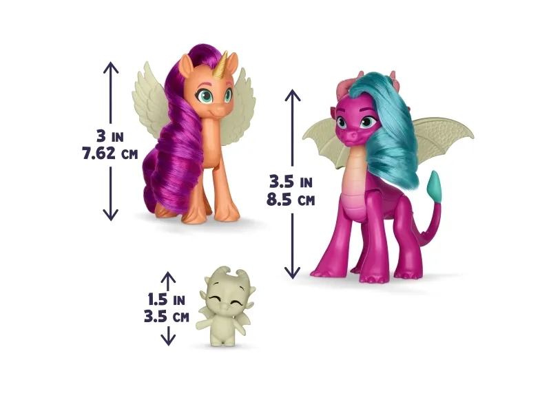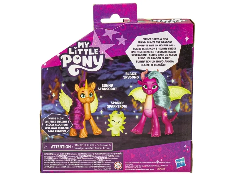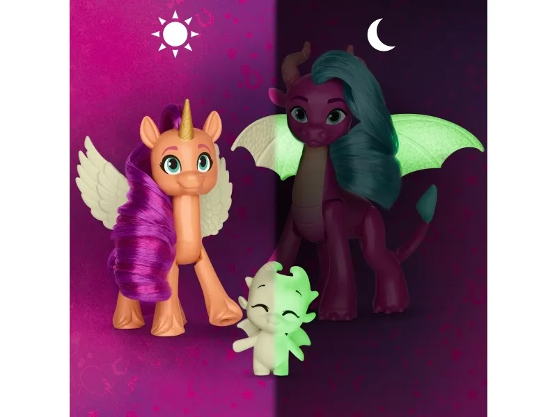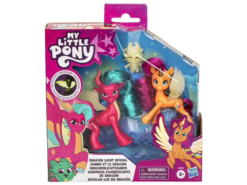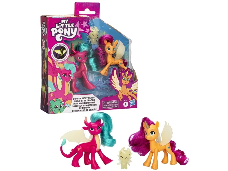 Discover glow-in-the-dark magic with My Little Pony Dragon Light Reveal 3-pack! This doll playset comes with 3 My Little Pony figures. Sunny Starscout and Blaize Skysong figures have articulated wings that glow in the dark. Mini Sparky Sparkeroni My Little Pony figure also glows in the dark! Sunny doll with hair features long, soft mane and tail that are fun to style and play with, and Blaize dragon figure has soft hair on her head. Figures are 3-inch in scale. Sunny and Blaize have Cutie Marks and articulated arms and legs for posing and imagining entertainment-inspired moments. This My Little Pony set makes a great gift for girls and boys. Imagine adventures in Equestria and beyond with this My Little Pony toy for girls, boys, and all kids.Tell Your Tale Dragon Light Reveal, 3 Glow in the Dark Dolls, 3-Inch Scale Toys for Girls and Boys Ages 4+. Recommended age (min): 3 yr(s), Product colour: Multicolour, Material: Plastic