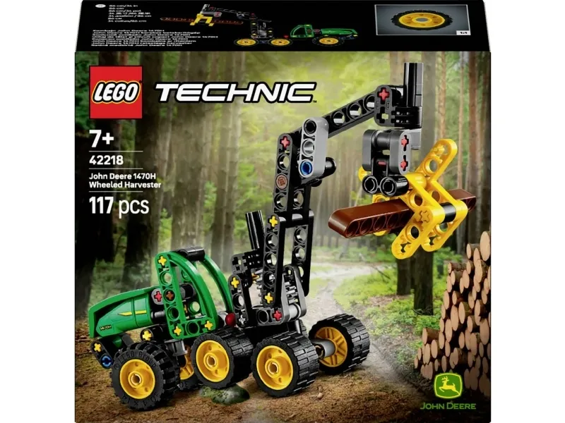 Der LEGO® Technic John Deere 1470H Rad-Harvester (42218) lädt Jungen und Mädchen ab 7 Jahren zu vielen Abenteuern im Wald ein. Die Forstmaschine hat jede Menge Funktionen, die junge John-Deere-Fans begeistern. Der Ausleger kann um 180 Grad schwenken. Kinder können den Greifer öffnen und schließen, um den Baumstaum zu greifen, anzuheben und wieder abzulegen. Dieses MINT-Spielzeug hat außerdem eine Wippenfederung und eine Knicklenkung, die Kinder ausprobieren können. Die spektakuläre John-Deere-Lackierung in Grün, Schwarz und Gelb lässt Kinder immer wieder gern mit diesem Spielzeug-Harverster spielen. Die Fahrzeuge aus LEGO Technic Sets bewegen sich wirklichkeitsgetreu und verfügen über eine Mechanik, die junge LEGO Baufans auf verständliche Weise an die Welt der Technik heranführt. Die LEGO Builder App mit verständlichen digitalen Bauanleitungen lässt Kinder selbstbewusst bauen, 3D-Modellansichten vergrößern und drehen und den Baufortschritt verfolgen. Das Set besteht aus 117 Teilen.