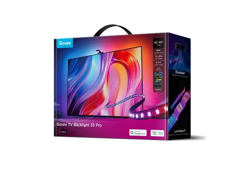 Bring the cinema home with Govee TV Backlight 3 Pro. Our advanced HDR triple-camera system delivers ultra-precise colors across multiple smart zones, adapting to every scene automatically. Enjoy professional 16-bit color accuracy and seamless smart home synchronization for movies, shows, and games. HDR Triple-Camera Precision: Industry-first HDR triple-camera captures colors with 1080p/30fps processing for perfect screen matching. Multi-Zone Calibration and Dual-Exposure Algorithm: Multi-zone calibration merging long and short exposure algorithms delivers edge-to-edge color accuracy across all screen content. 16-Bit RGBWWIC Chips & LuminBlend™: 16-bit color chips and warm/cool white LEDs reproduce cinematic hues with 30% brighter high-density lighting. AI Film Mood Matching: Smart filters auto-adjust colors by film genre intellgently matching movie atmospheres. 10-Device DreamView Sync: Next-gen Bluetooth enables millisecond response for whole-room lighting coordination.