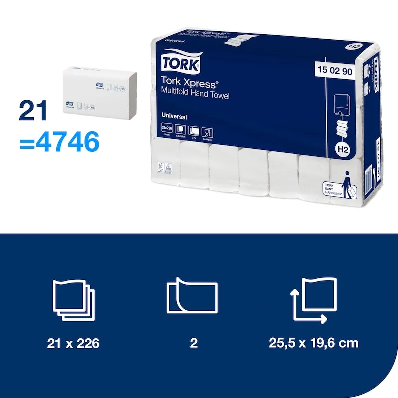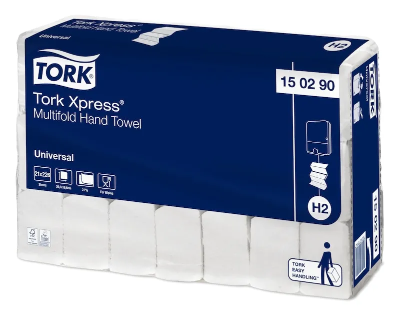 Få dækket behovet for helt almindelig håndaftørring med Universal Tork Xpress® Soft Multifold håndklædeark til fornuftige priser. Håndklædearkene passer i Tork Xpress® Multifold Håndklædeark Dispenser til toiletter med middel brugerfrekvens. God, hvor pladsen er trang og bekvem og hygiejnisk for dine gæster.