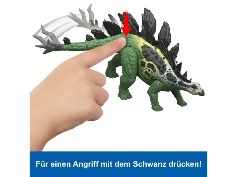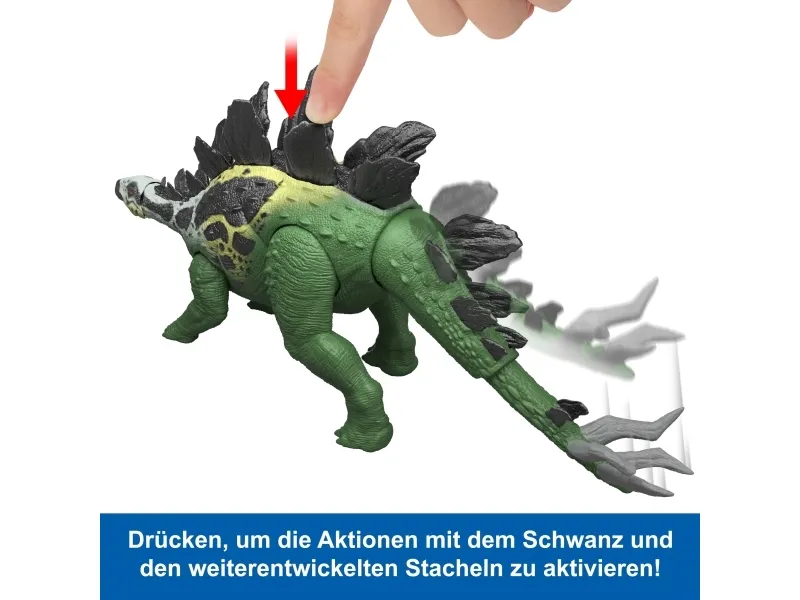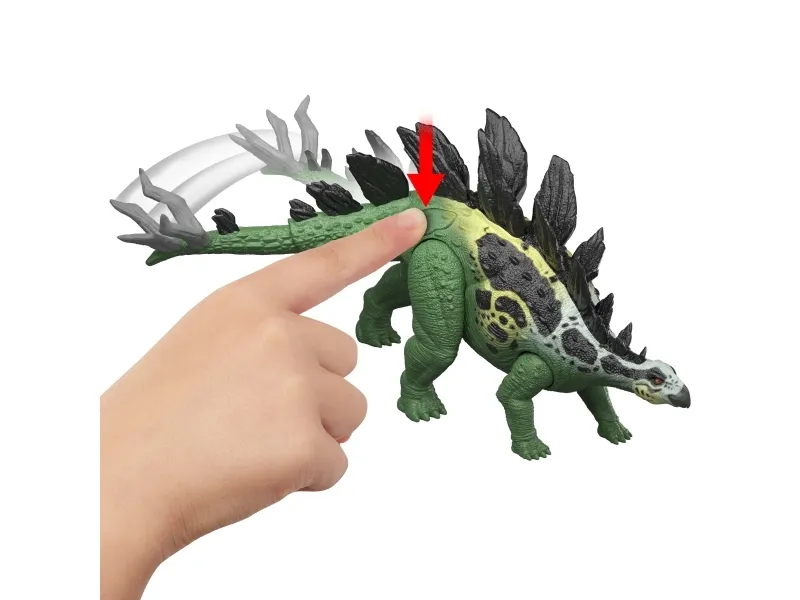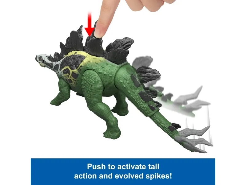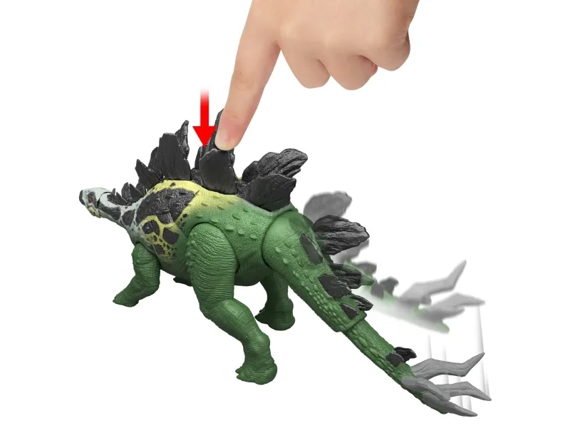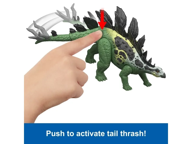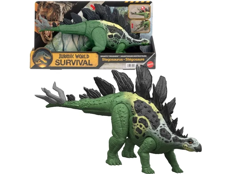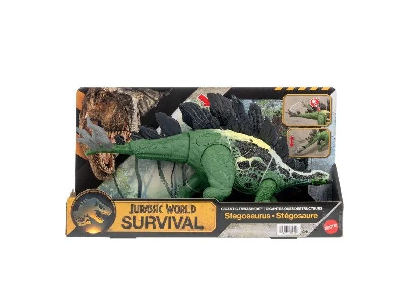 This Jurassic World Gigantic Thrashers Stegosaurus action figure has 2 dramatic attack motions as well as an evolution feature. A button on the side activates a dramatic tail side-swipe attack action. Pushing on the button on the back plate activates an upward swiping attack as well as the 'evolution' tail plate expansion for offensive power. At 14 inches long, with authentic sculpting, deco and texture, this large species toy is ready for battle play or fierce posing. Scan the Tracking Code on the Stegosaurus' foot in the free Jurassic World Play App with a compatible smart device (Android or iOS, not included) to unlock a digital version of the dinosaur and play the fiercely fun game to race vehicles on land, air and sea. This toy is suitable for dinosaur fans ages 4 years and up. Colours and decorations may vary.Jurassic World GIGANTIC THRASHERS Stegosaurus. Recommended age (min): 4 yr(s), Product colour: Green, Material: Plastic