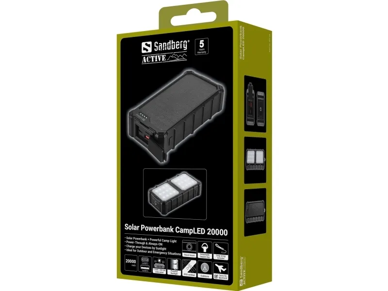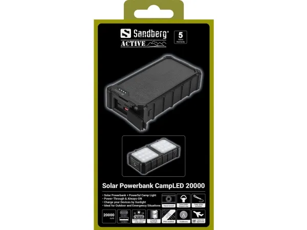 Artikelnummer: [25241046] | Produzent: Sandberg | Modell nummer: SOLAR POWERBANK CAMPLED 20000 | EAN: 5705730421242