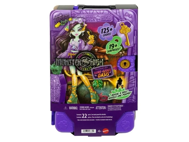 Reveal a Monster High doll, unlock accessories, and take the trip of an unlifetime with Skulltimate Secrets, Destination: Gore-geous Oasis! Kids can discover the secret to a dream scare-cation with this spooky set, which includes over 19 surprises -- but first, they must find the three keys that will, one-by-one, unlock all the travel-themed clothing and accessories! Each sold separately, subject to availability. Fully articulated. Dolls cannot stand alone. Colors and decorations may vary.