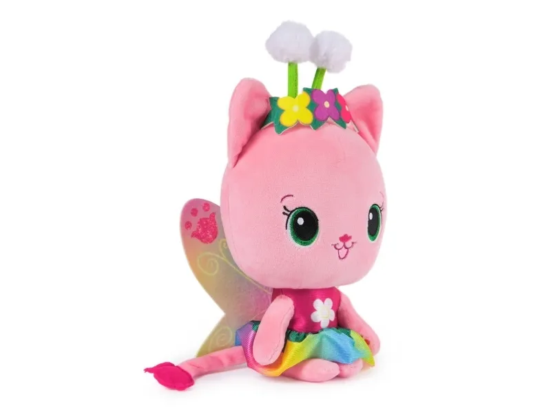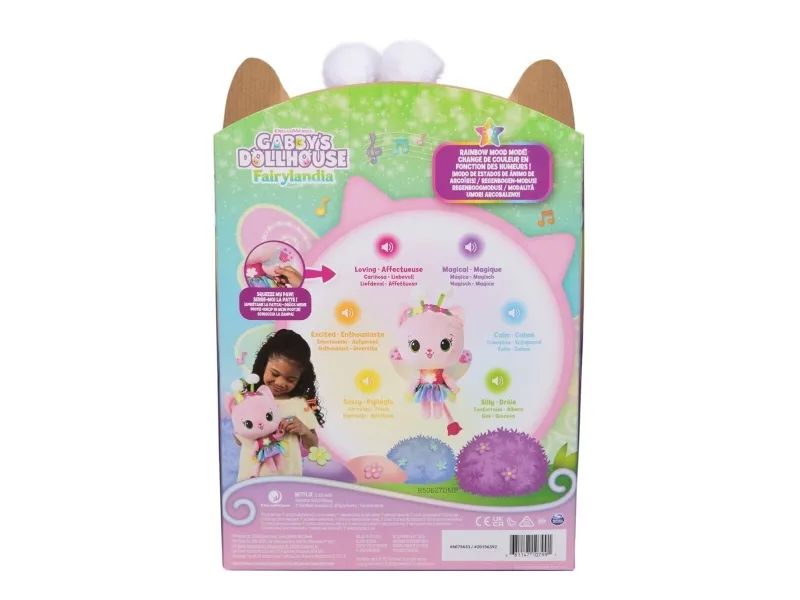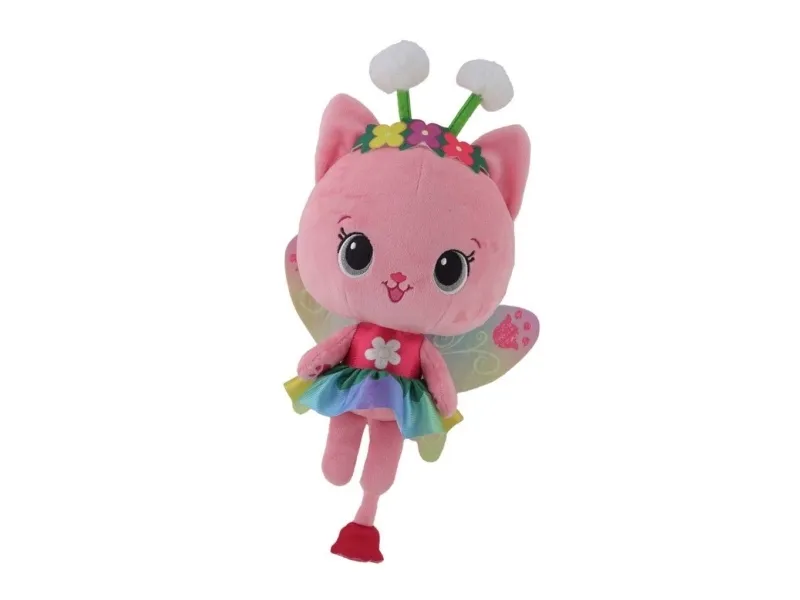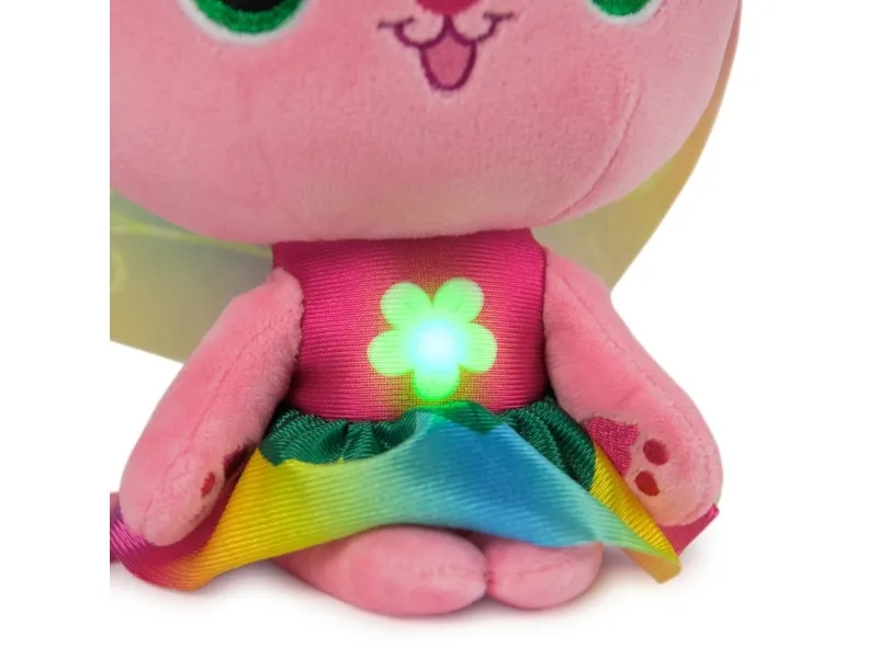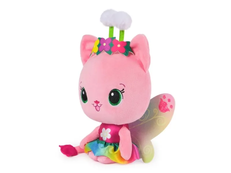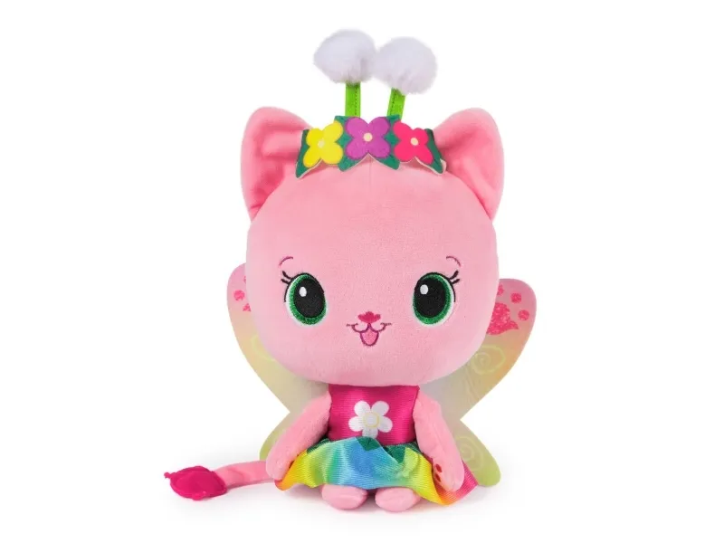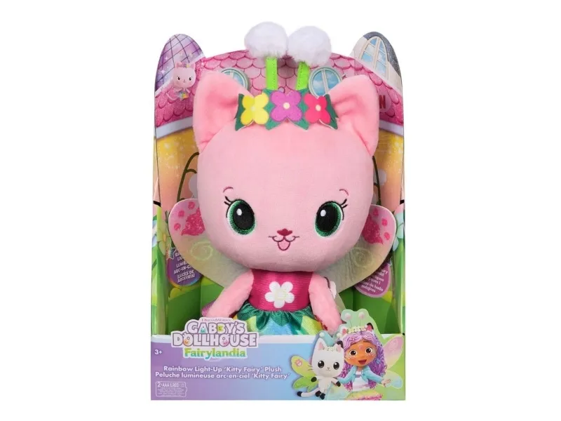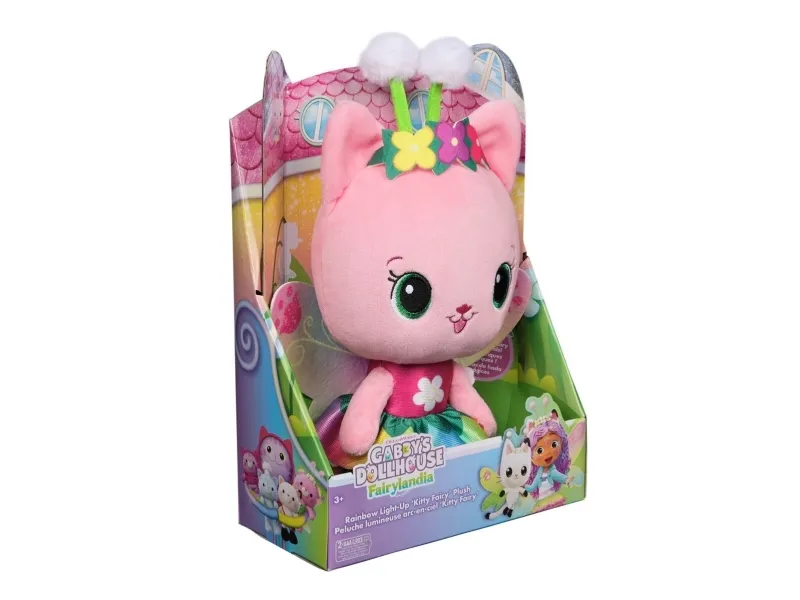 Bring home the magic of Gabby’s Dollhouse and introduce a sprinkle of magic to your child’s playtime with the Rainbow Light-Up Kitty Fairy plush! This 30 cm Kitty Fairy toy features the magical Kitty Fairy looking flutter-riffic in a colorful rainbow dress with delicate wings, pom pom diddly boppers adorned by her flower crown, and a pretty rainbow dress with a flower that lights up in different colors, providing extra sensory play! With a gentle press of her paw, the center of the flower on her dress illuminates in one of six dazzling colors, creating a meow-mazing ambiance for soothing kids at bedtime or igniting their imaginations at playtime. Each delightfully snuggly, squishy stuffed animal lets Gabby’s Dollhouse fans act out their own cuddly role play fun and recreate scenes from the show with endless storytelling adventures! Gabbys Dollhouse toys are purrfect gifts for kids to relive cherished moments from the cartoon. Whether creating new adventures with toddler toys, like doll house accessories and furniture, her meow-mazing cat friends, or fin-tastic mermaid toys, our soft toys make cute room decor and impressive gifts for girls and any fan, inviting endless hours of cat-terrific adventures! Ages 3 and up. Hand wash only.