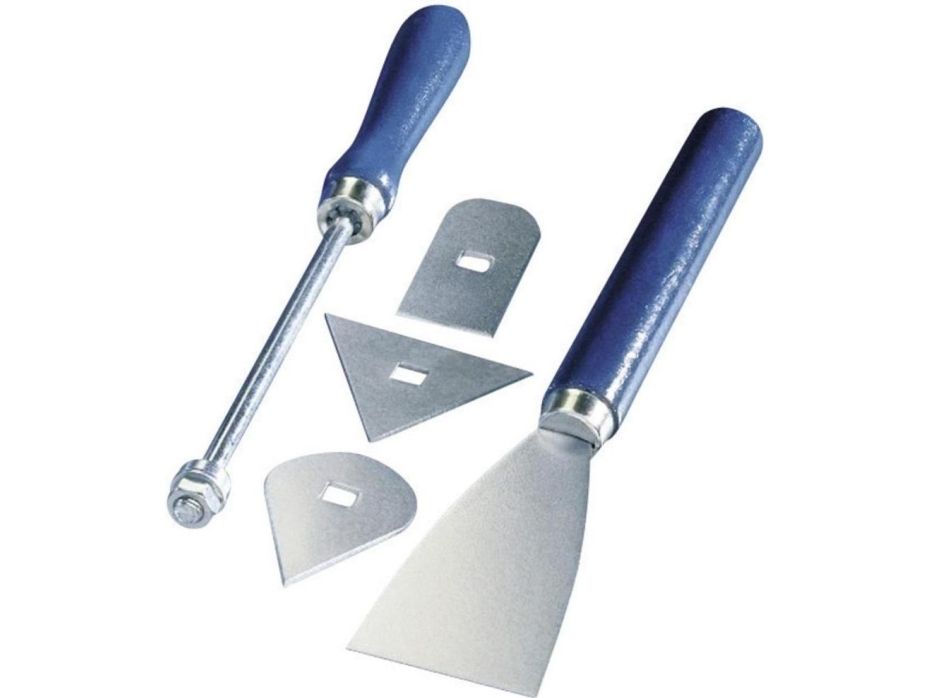 Das Farbschaber-Set von Steinel dient zum komfortablen Entfernen von Farben oder Lacken in Verbindung mit ihrem Heißluftgebläse.