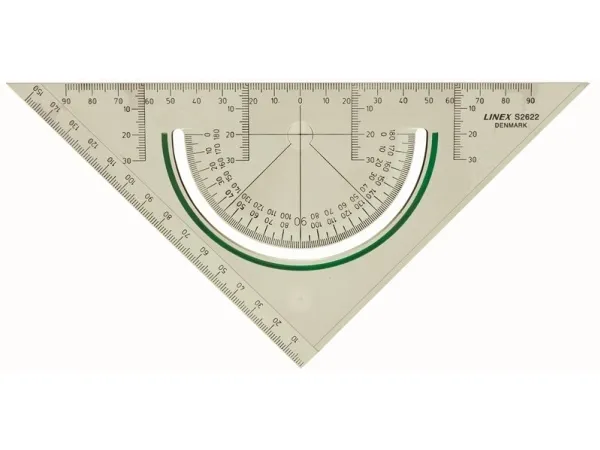 Linex S2622 geometritrekant 22 cm i Linex Super Series med det unikke antislide princip. En gummiliste på bagsiden griber fat i den underliggende flade, og trekanten ligger fast. Kan anvendes som lineal, vinkelmåler og tegnetrekant. Med tuschkant, facet og lige kant samt vinkelmåler med lup over nulpunktet.