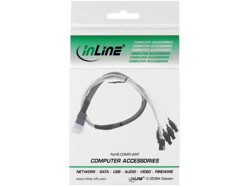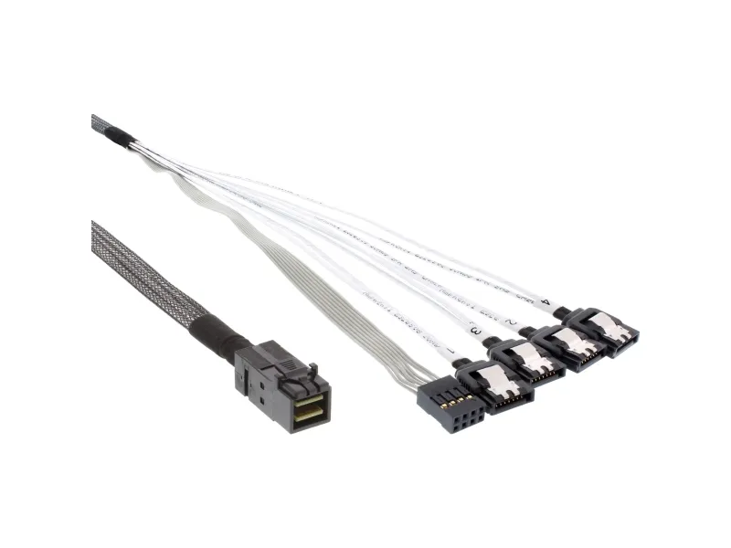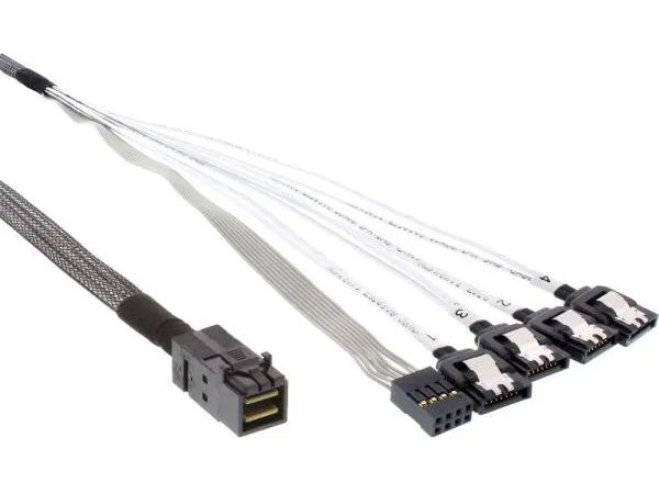 This internal mini SAS HD cable is suitable for connecting devices with a Mini SAS HD 4i (SFF-8643) interface and other side with SATA connector, for example it can be connected to a SAS controller with a backplane or HDD.\n\n- Mini SAS HD connector (SFF-8643) to 4x SATA connector + Sideband plug\n- Straight SFF-8643 plug\n- Cable for internal connection