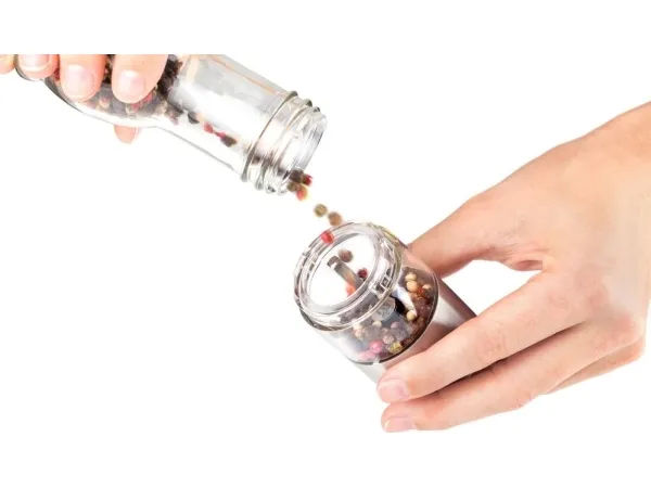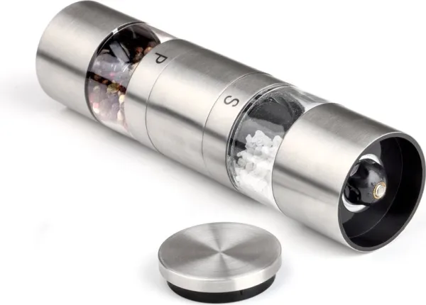 This spice/pepper/salt grinder is made from stainless steel and plastic with a ceramic grinding mechanism with adjustable grinding fineness. Two clear hoppers make it possible to see how full the grinder is. Grinder is controlled by turning a mechanism on both sides. The grinder comes with lids for capturing remaining spices.