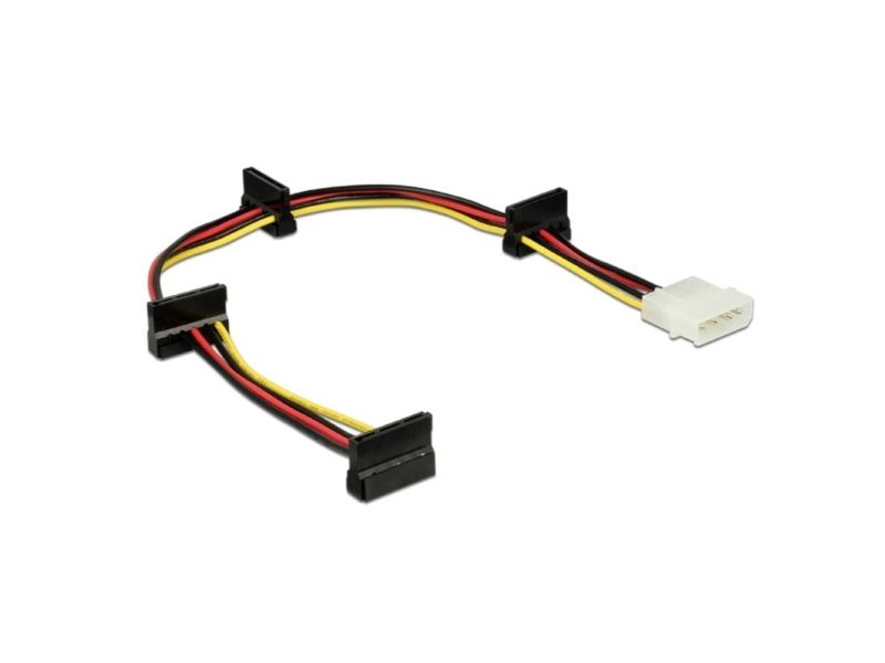 This power cable can be connected to 4 SATA devices and supplies power via one Molex 4 pin port of a power supply.