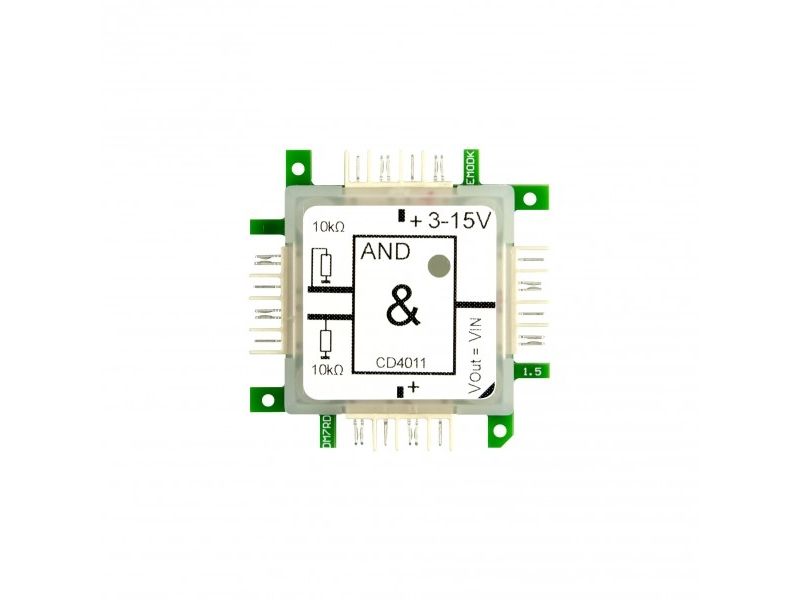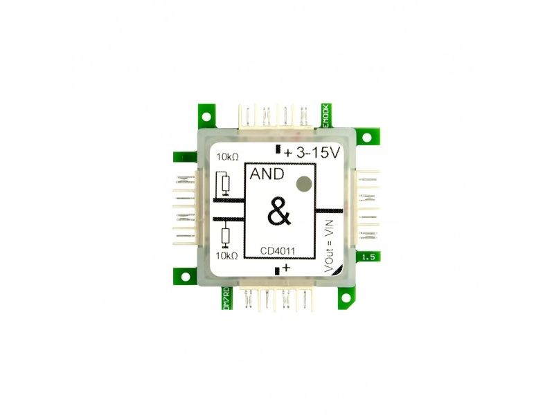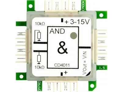 Das Gatter realisiert eine logische AND-Verknüpfung mit 2 Eingängen, basierend auf 1/4 CD4011. Die Eingänge sind über je einen 10 kO Pulldown-Widerstand mit Masse verbunden. Versorgungsspannung: +5..15 V.