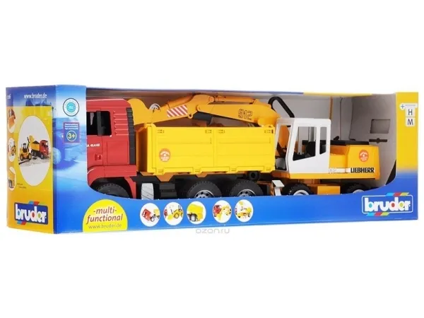 Erde mit dem Bagger bewegen, damit den Kippanhänger beladen und direkt abtransportieren. All das geht mit diesem Set, bestehend aus Liebherr Bagger und MAN Kipplaster, im Handumdrehen. Die Bordwände des Kipplastwagens sind nach drei Seiten klappbar, um die transportierte Last in alle drei Richtungen abladen zu können. Zudem kann die Mulde gekippt und arretiert werden. Der Baggerarm des Liebherr Schaufelbaggers ist voll funktionsfähig und der Bagger kann um 360° auf dem Unterwagen gedreht werden, wobei zwei Stützen sicheren Stand bieten. Um die Spielmöglichkeiten zu erweitern, kann der Kipplastwagen mit dem Light and Sound Module (Art.-Nr.: 02801) durch einfaches Aufstecken des Moduls ausgestattet werden (nicht im Lieferumfang enthalten).
