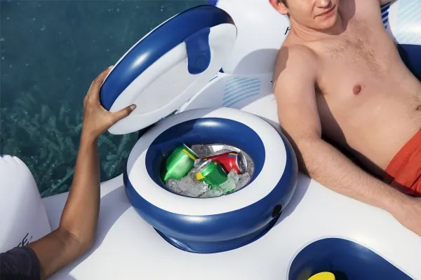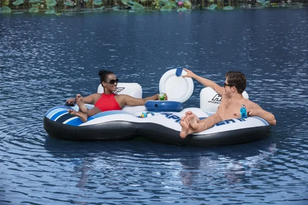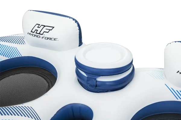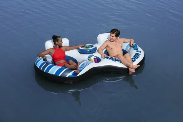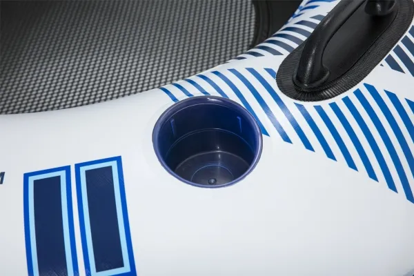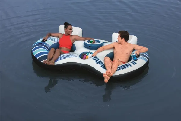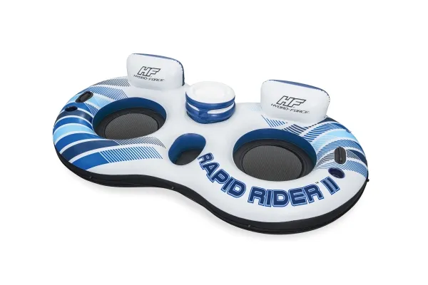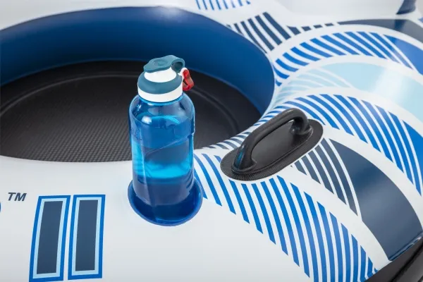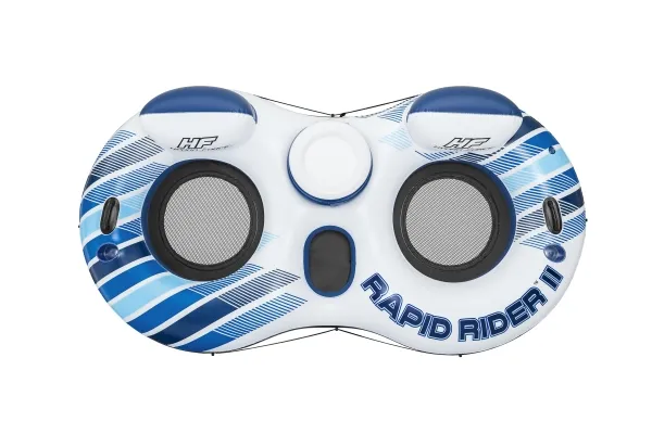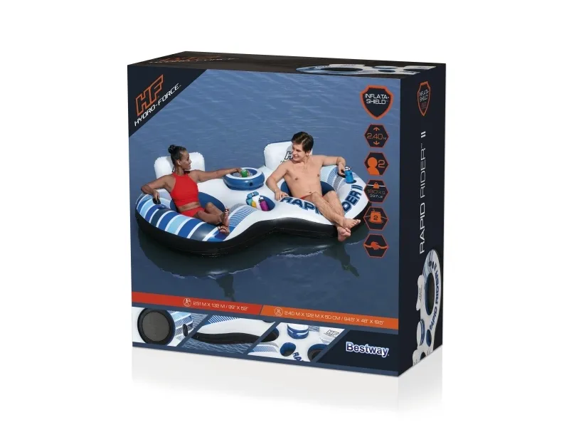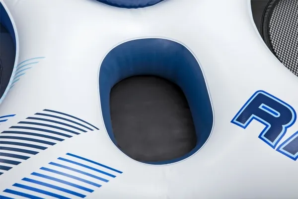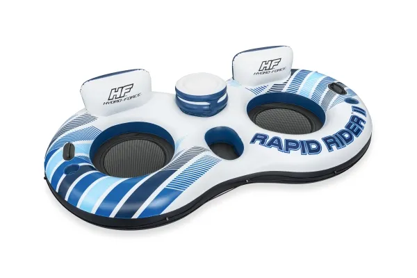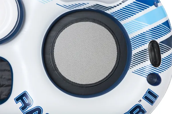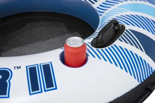 RAPID RIDER X2 TUB - Safety valves - Sturdy pre-tested vinyl - Two heavy-duty handles - Two cup holders - All around grab rope with built-in grommets - Premium construction with backrest - Cool mesh bottom - Include removable cooler bag - Heavy-duty repair patch included - Content: One rider, one cooler bag, repair patch