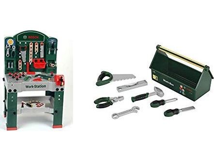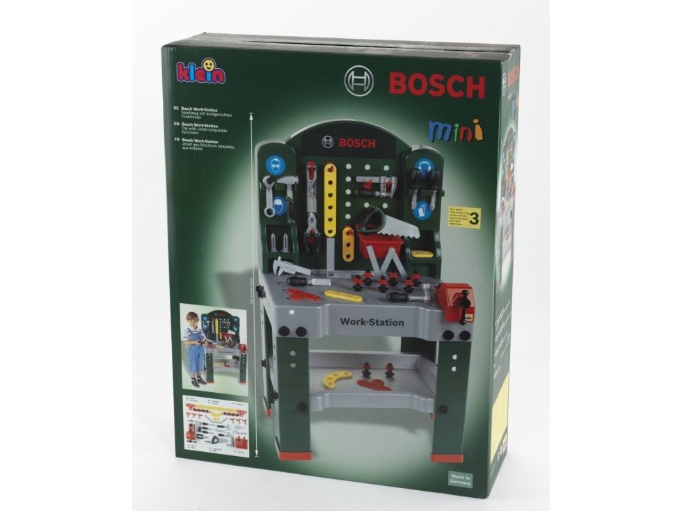 Bosch 44 - teilige Work-Station - Arbeitsplatte mit Lernfunktion - Maße der Werkbank (L x B x H): 61 x 44,5 x 101 cm - Work-Station im Bosch Design Werkbank mit zahlreichem Zubehör: Schlitz- und Kreuzschlitzschraubendreher, Schraubenschlüssel, Ratsche, Zange, Feile, Hammer, Säge, Waage, Winkel, Metermaß und Schraubzwinge, Schraubstock, Ablagekasten, Aufhängehaken, Schrauben, Muttern und Schraubelemente in verschiedenen Größen und Formen - Geeignet für Kinder ab 3 Jahren - Made in Germany
