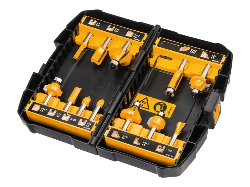 - Set containing Round, V-Groove, Dovetail, Cove, Roman Ogee, Chamfer, Straight, Trim and Round Over cutters