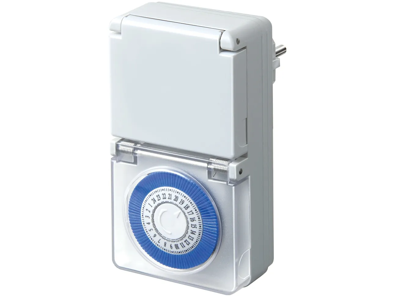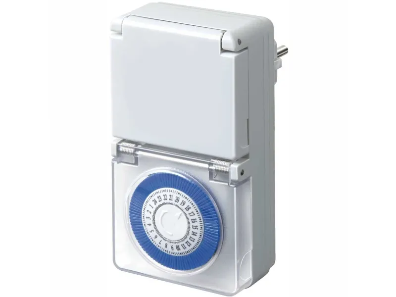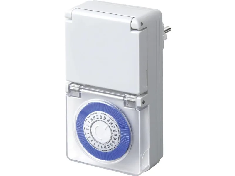 Mechanische Zeitschaltuhr MMZ 44 IP44 - Für den Einsatz im Freien. Spritzwassergeschützt, IP 44. - Tageszeitschaltuhr mit 24 Stunden-Programm. - Mit transparenter Schutzabdeckung. - 96 Ein-/Ausschaltzeiten pro Tag. - Minimaler Schaltabstand: 15 Minuten. - Sehr kompakte Bauform. - Sehr einfache Bedienung. - Steckdose mit Kinderschutz. - Im Blister verpackt. - Nennspannung: 230 V - Nennstrom: 16 A